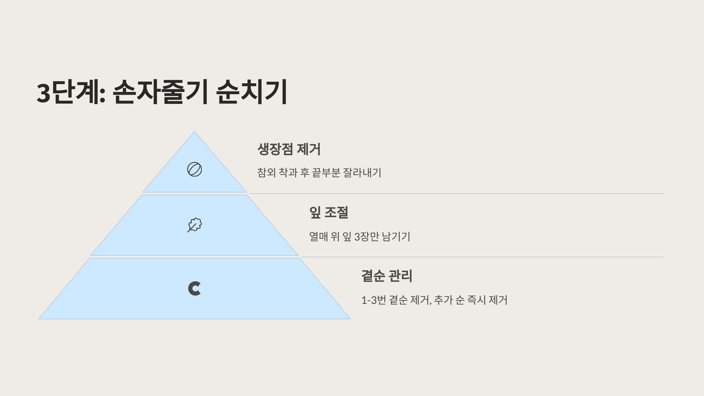1~2번 곁순은 완전히 제거하고, 3~5번 곁순은 아들 줄기로 키웁니다. 이 과정은 영양분 분산을 막고 아들 줄기 성장을 촉진해요.