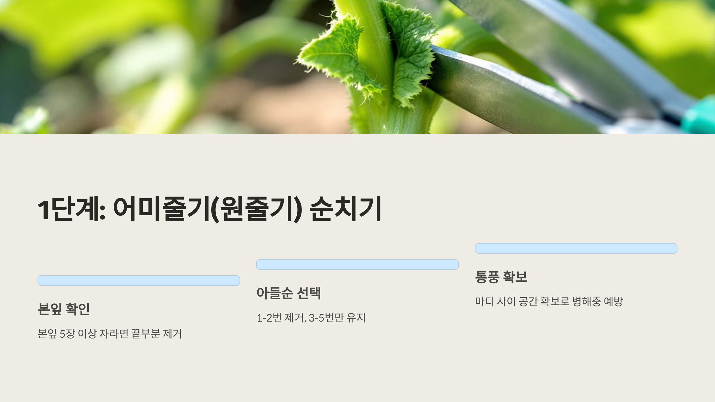 | 본줄기 | 잎 5~6장 후 끝 자르고, 1~2번 곁순 제거 | 아들 줄기 성장 | 깔끔한 절단 |