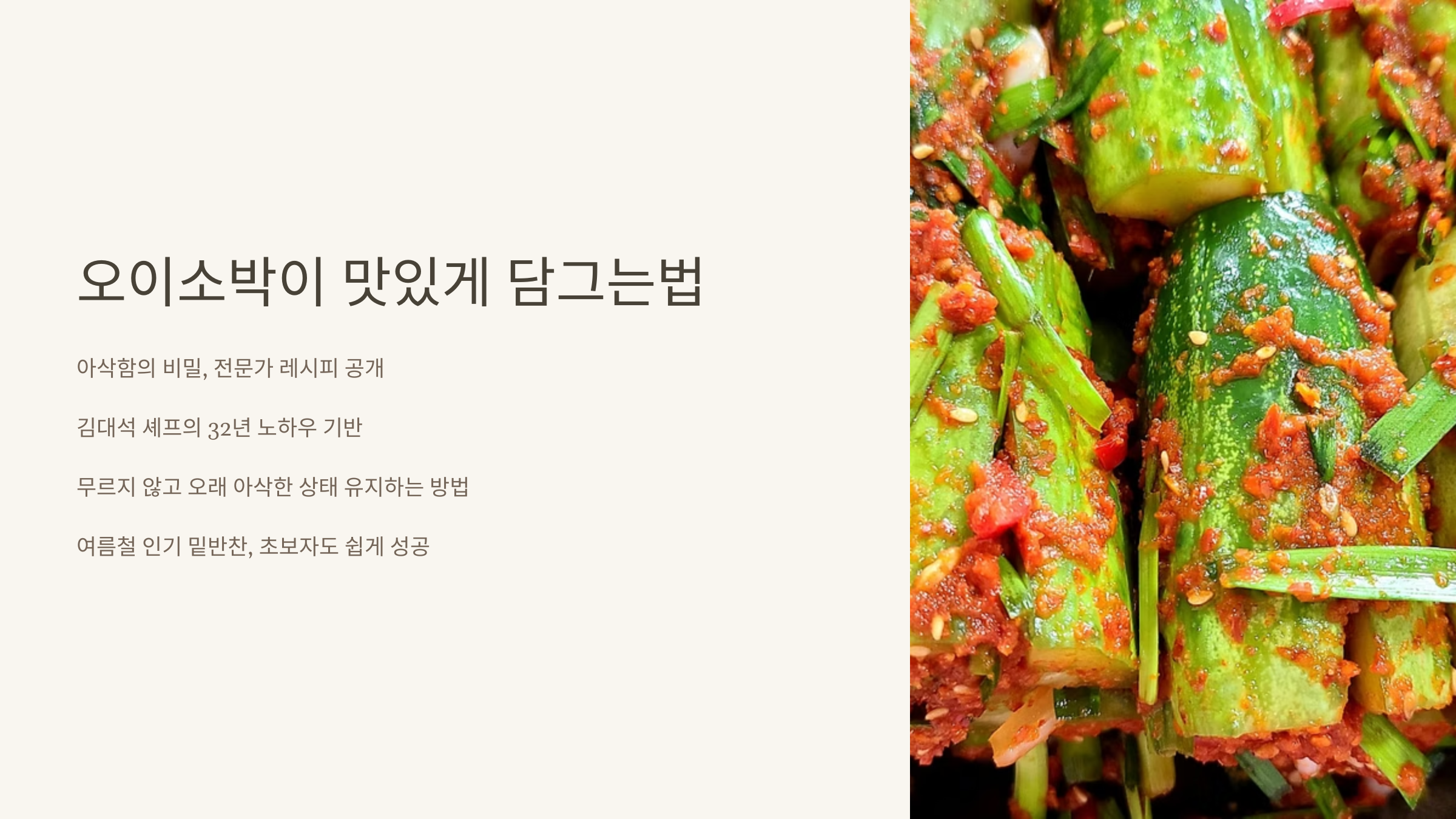 안녕하세요! 😊 오늘은 여름철 밥도둑, 생각만 해도 입안에 침이 고이는 **오이소박이 맛있게 담그는법**을 여러분께 소개해 드리려고 합니다. 아삭아삭 씹히는 오이의 식감과 매콤하면서도 시원한 양념의 조화는 정말 일품이죠.