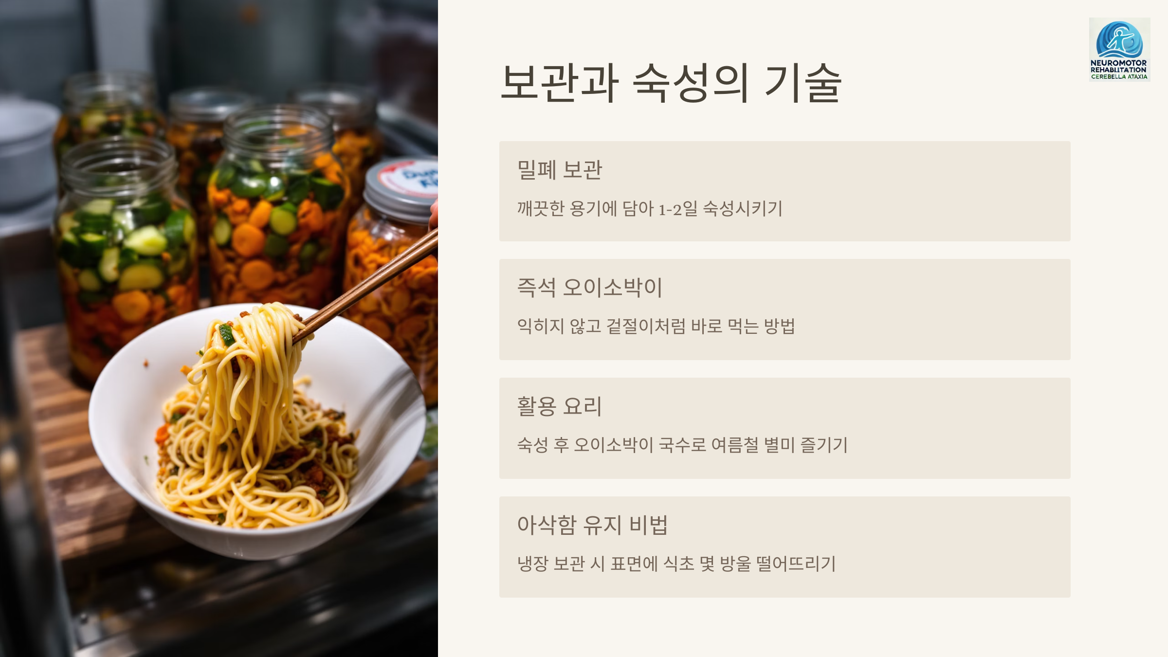 갓 담근 오이소박이도 맛있지만, 적절한 숙성을 거치면 더욱 깊은 맛을 즐길 수 있습니다. 실온에서 반나절에서 하루 정도 숙성시킨 후 냉장 보관하면 됩니다. 날씨나 보관 환경에 따라 숙성 시간은 조절해주세요.