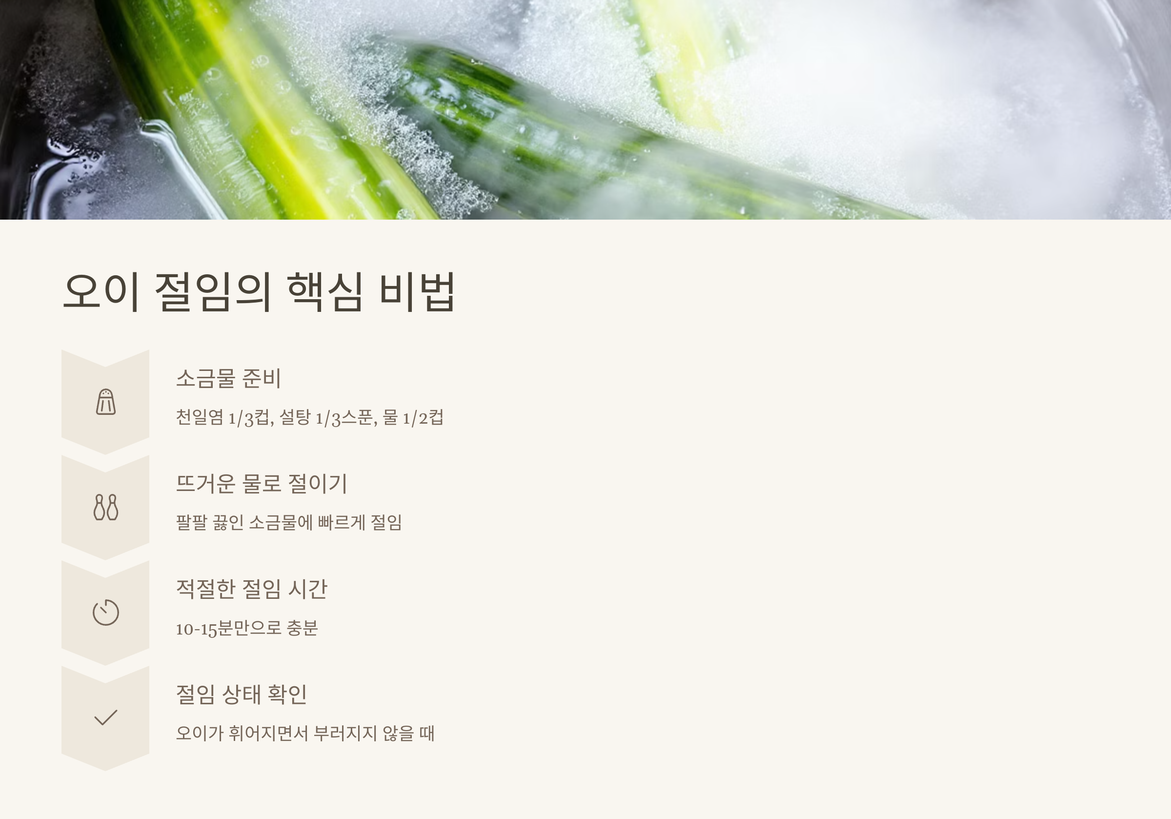 칼집 낸 오이는 끓는 소금물에 살짝 데치거나 (약 10~20초), 뜨거운 소금물을 부어 절이면 더욱 아삭해집니다. 또는 전통적인 방법으로 굵은 소금을 뿌려 30분~1시간 정도 절여주세요.
