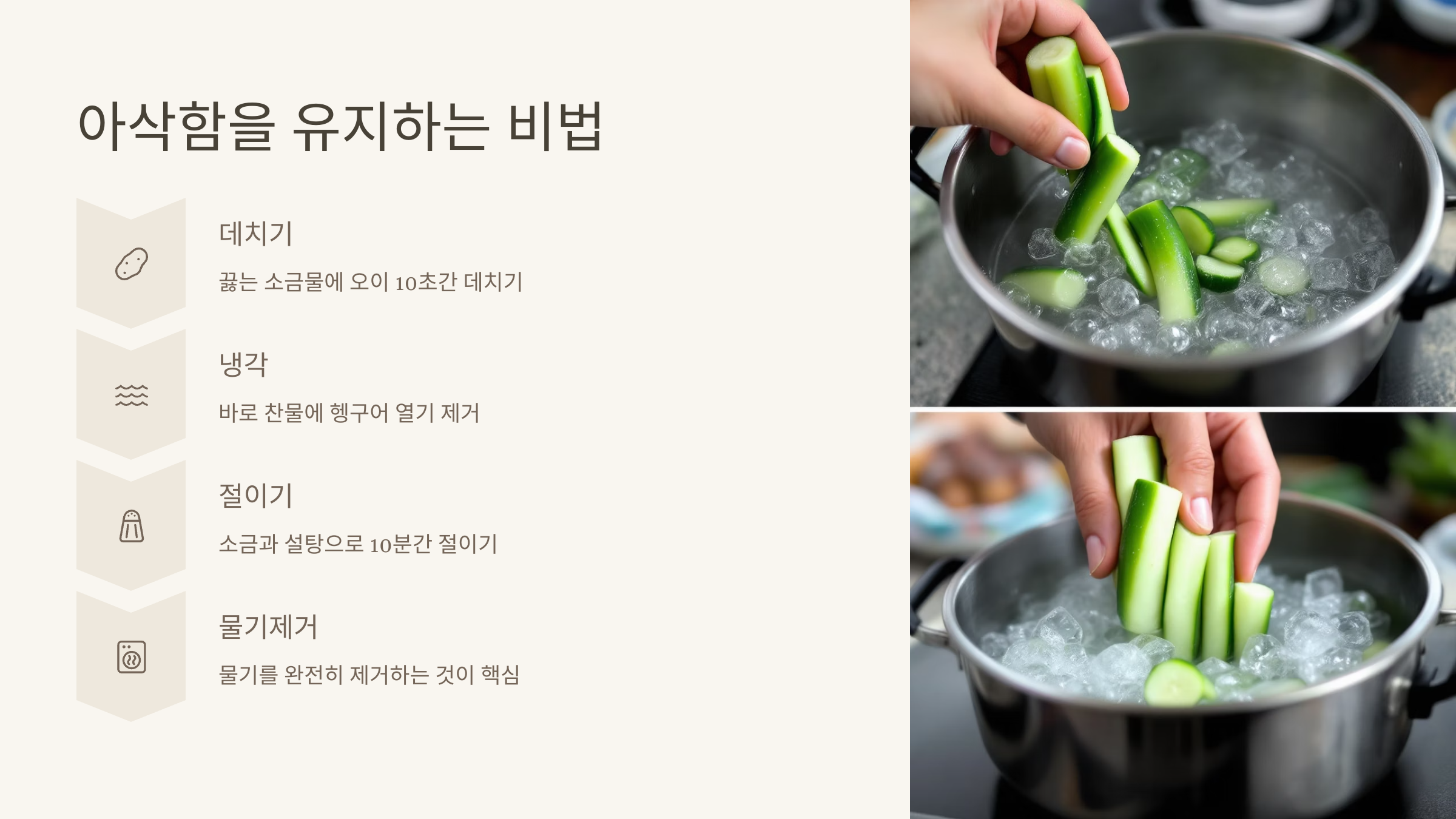 오이무침의 생명, 바로 아삭한 식감이죠! 이 식감을 제대로 살리기 위한 첫 번째 비결은 바로 '절이기' 과정입니다. 오이를 소금에 절여 수분을 적절히 빼주는 것이 중요해요.