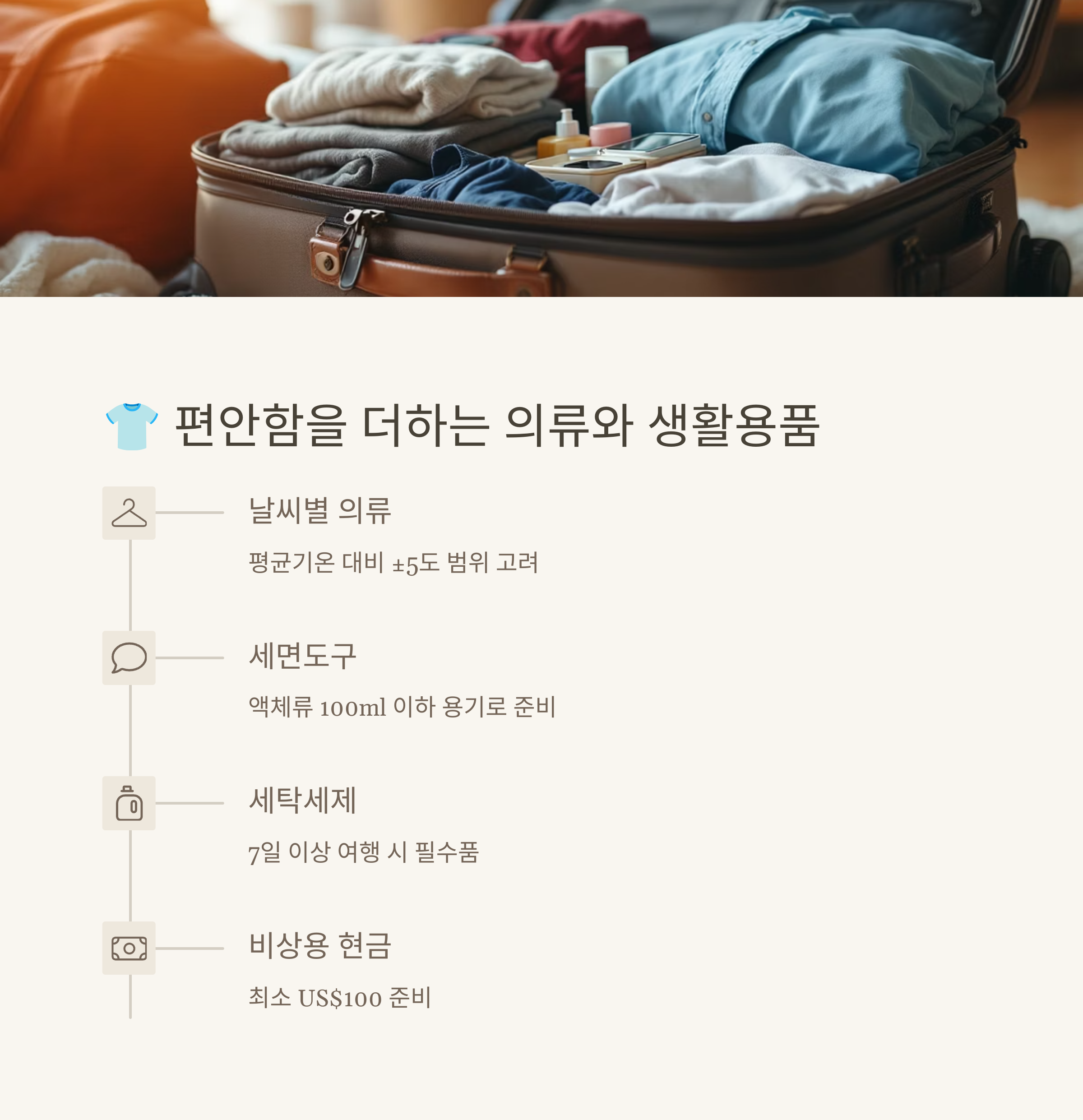 의류는 여행지 날씨를 철저히 확인하고 레이어링이 가능한 옷들로 구성하는 것이 좋습니다. 해외 여행 준비물 체크리스트에서 의류는 부피를 많이 차지하므로 꼭 필요한 것만 선별하세요.