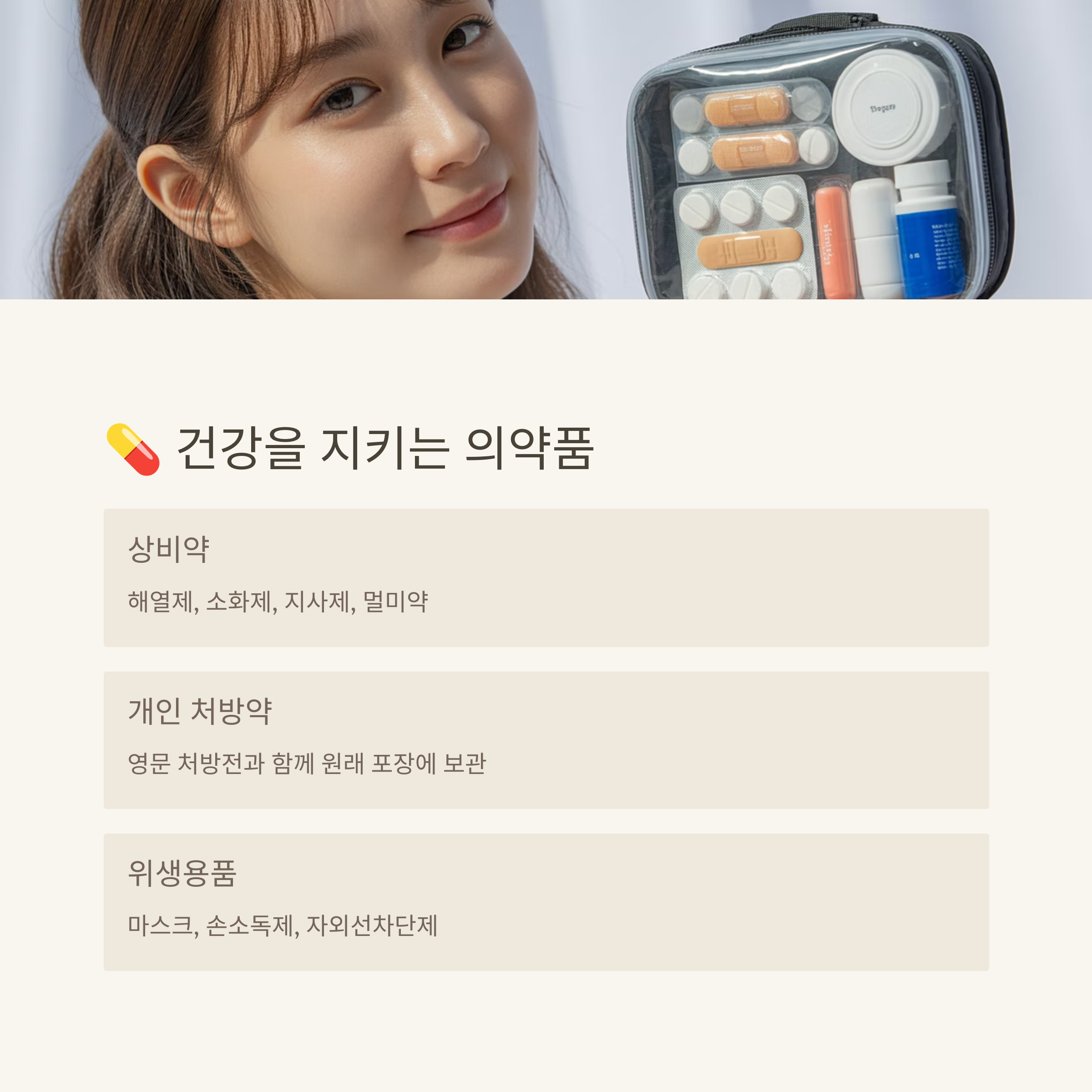 특히 현지에서 언어 문제로 의약품 구매가 어려울 수 있으니, 해외 여행 준비물 체크리스트에 기본적인 상비약은 꼭 포함시키세요. 약품은 원래 패키지에 보관하고, 필요시 처방전이나 의사소견서를 지참하는 것이 좋습니다.