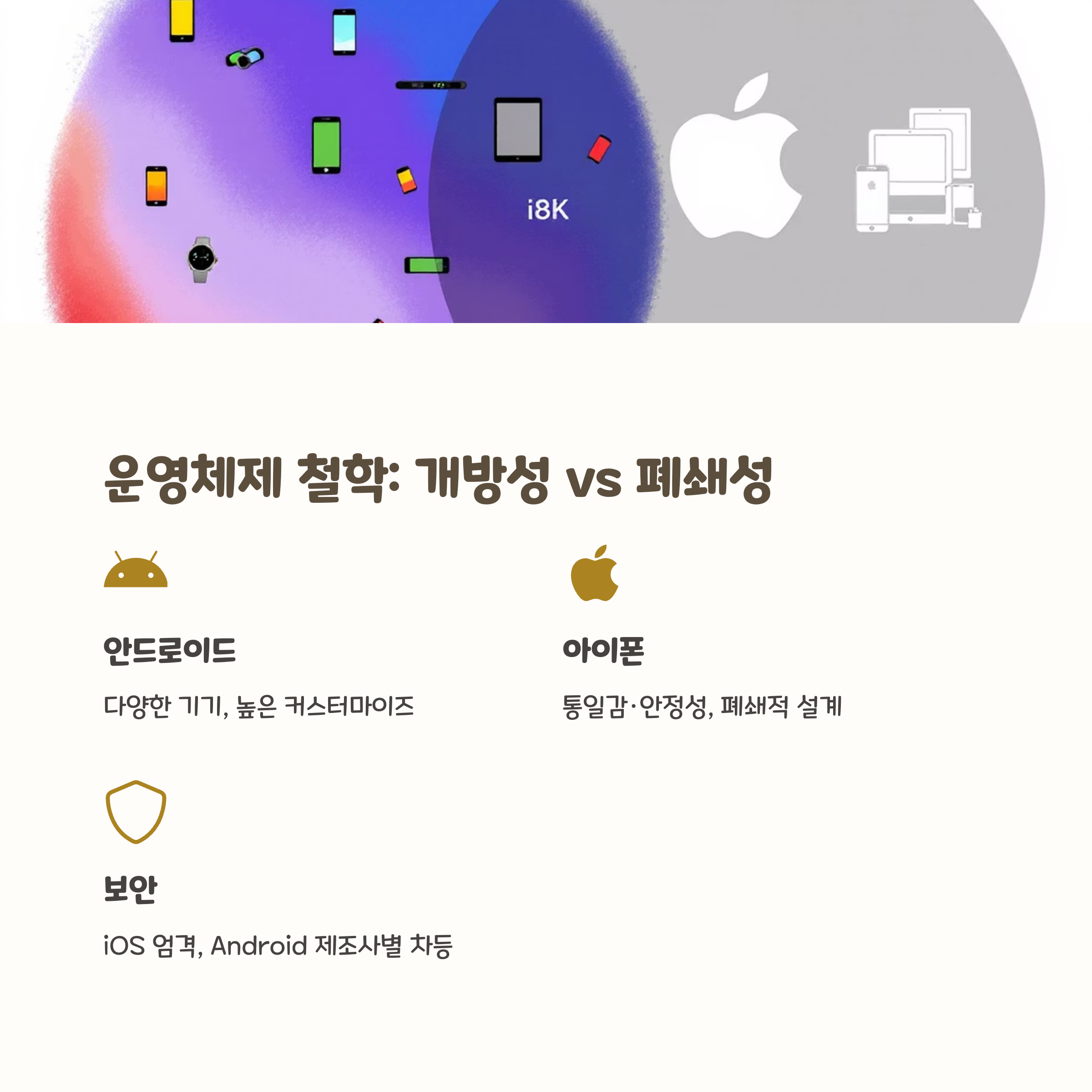 반면 애플의 iOS는 '폐쇄적 생태계'를 기반으로 합니다. 하드웨어와 소프트웨어를 애플이 직접 통제함으로써, 일관성 있고 안정적인 사용자 경험 및 강력한 보안을 제공하는 데 중점을 둡니다.
