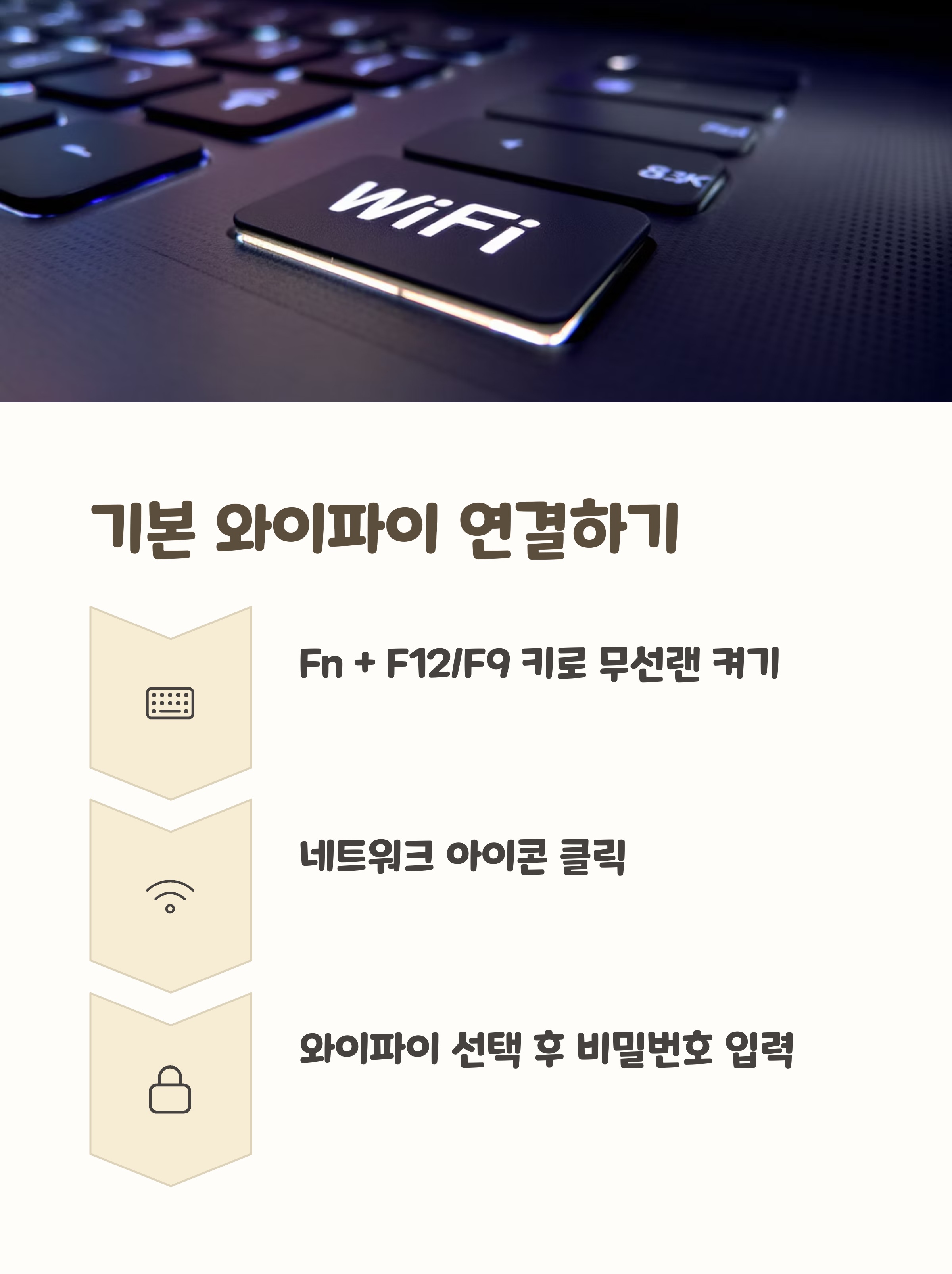 - 와이파이 기능 활성화: 키보드의 와이파이 단축키를 눌러 와이파이 기능을 켭니다 (보통 F2, F3 또는 비행기 모양 아이콘)