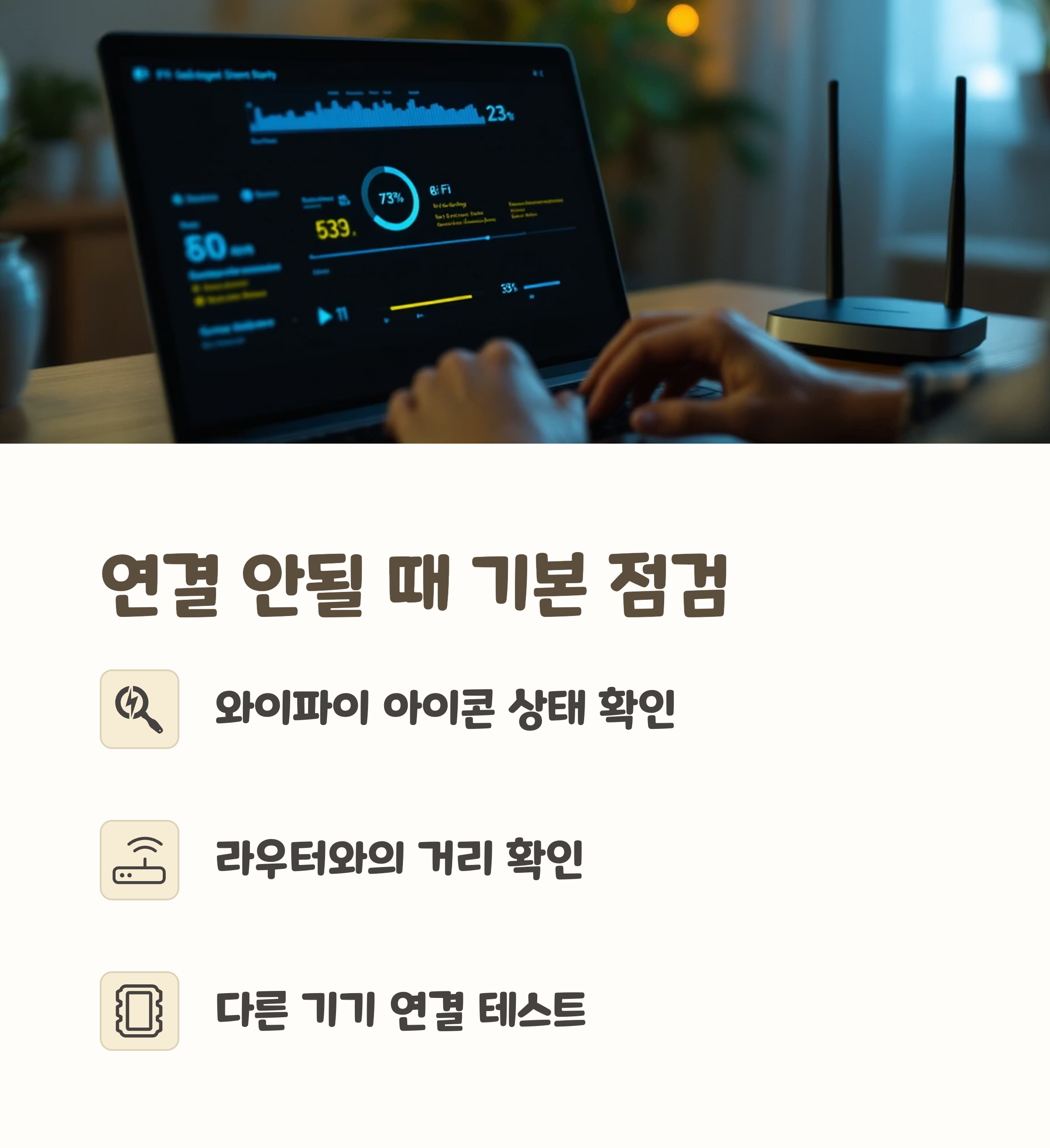 - 비밀번호 재확인: 정확한 와이파이 비밀번호를 입력했는지 확인하세요 (대소문자 구분)