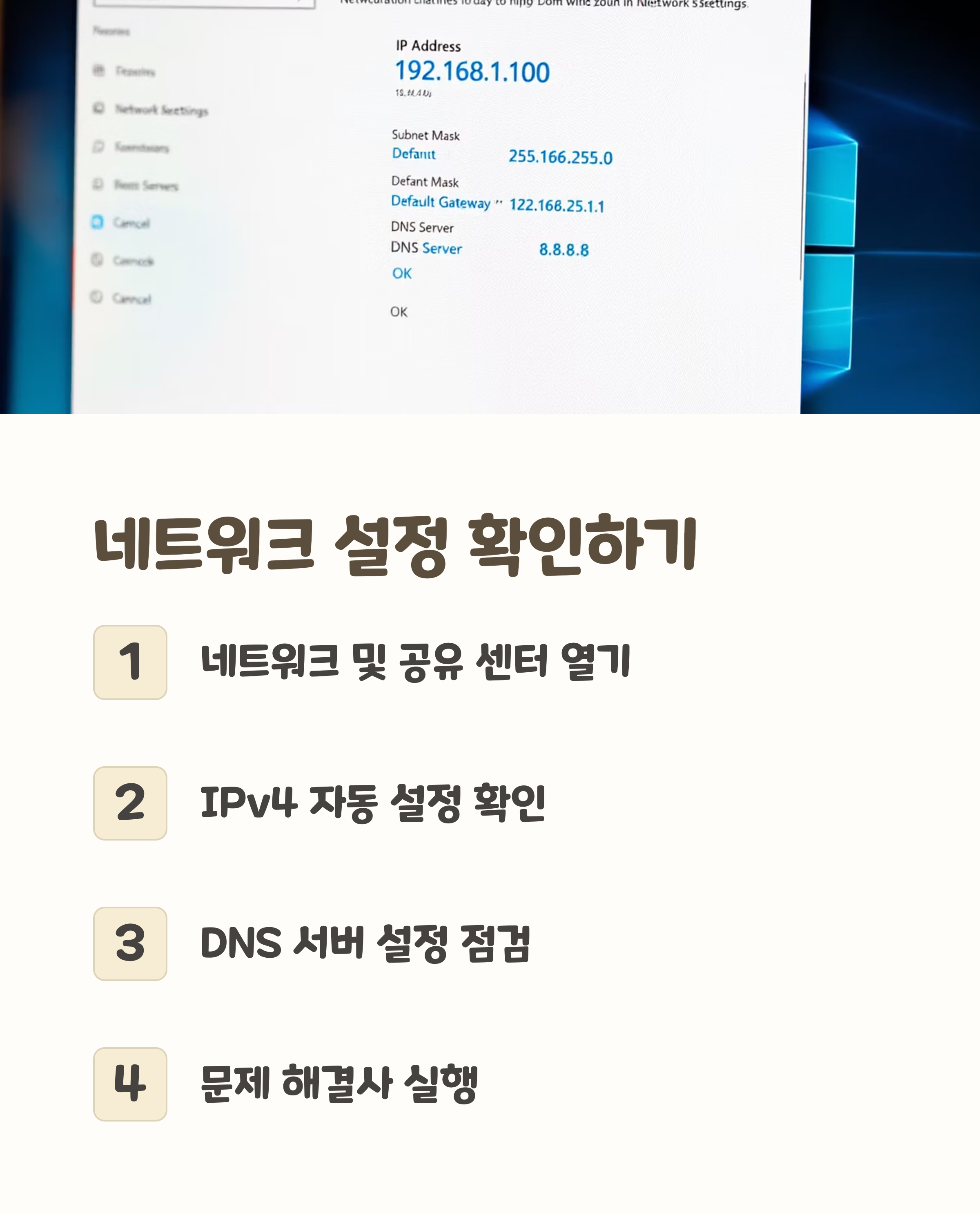 ipconfig /release후ipconfig /renew명령어를 입력해보세요 - DNS 설정 변경: DNS 서버를 Google(8.8.8.8) 또는 Cloudflare(1.1.1.1)의 공용 DNS로 변경해보세요
