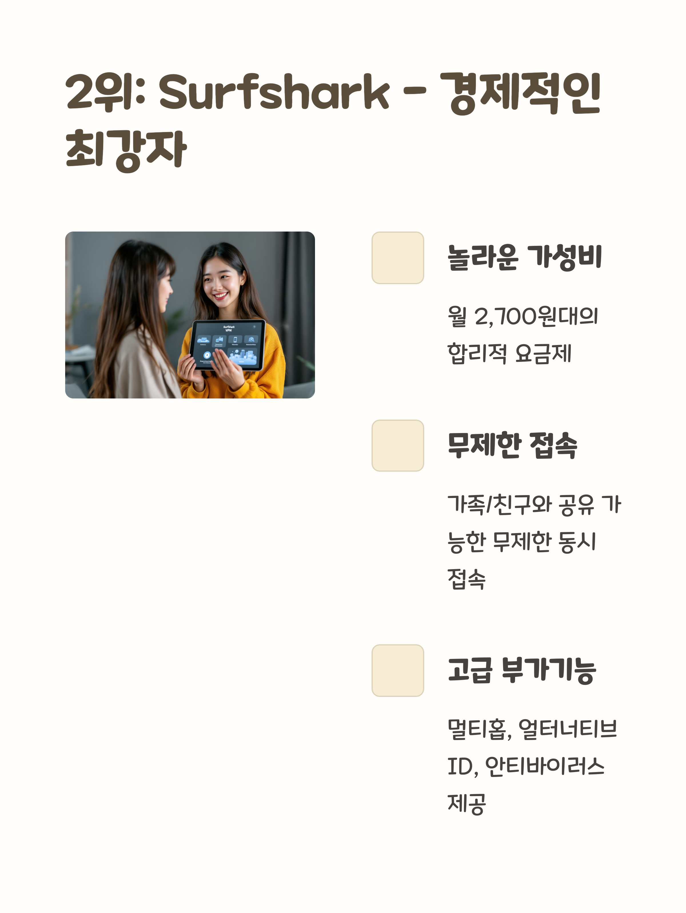 Surfshark는 합리적인 가격에 뛰어난 기능과 무제한 동시 기기 연결이라는 강력한 장점을 제공하는 VPN입니다. 하나의 구독으로 가족 모두의 기기를 보호할 수 있어 경제적입니다.