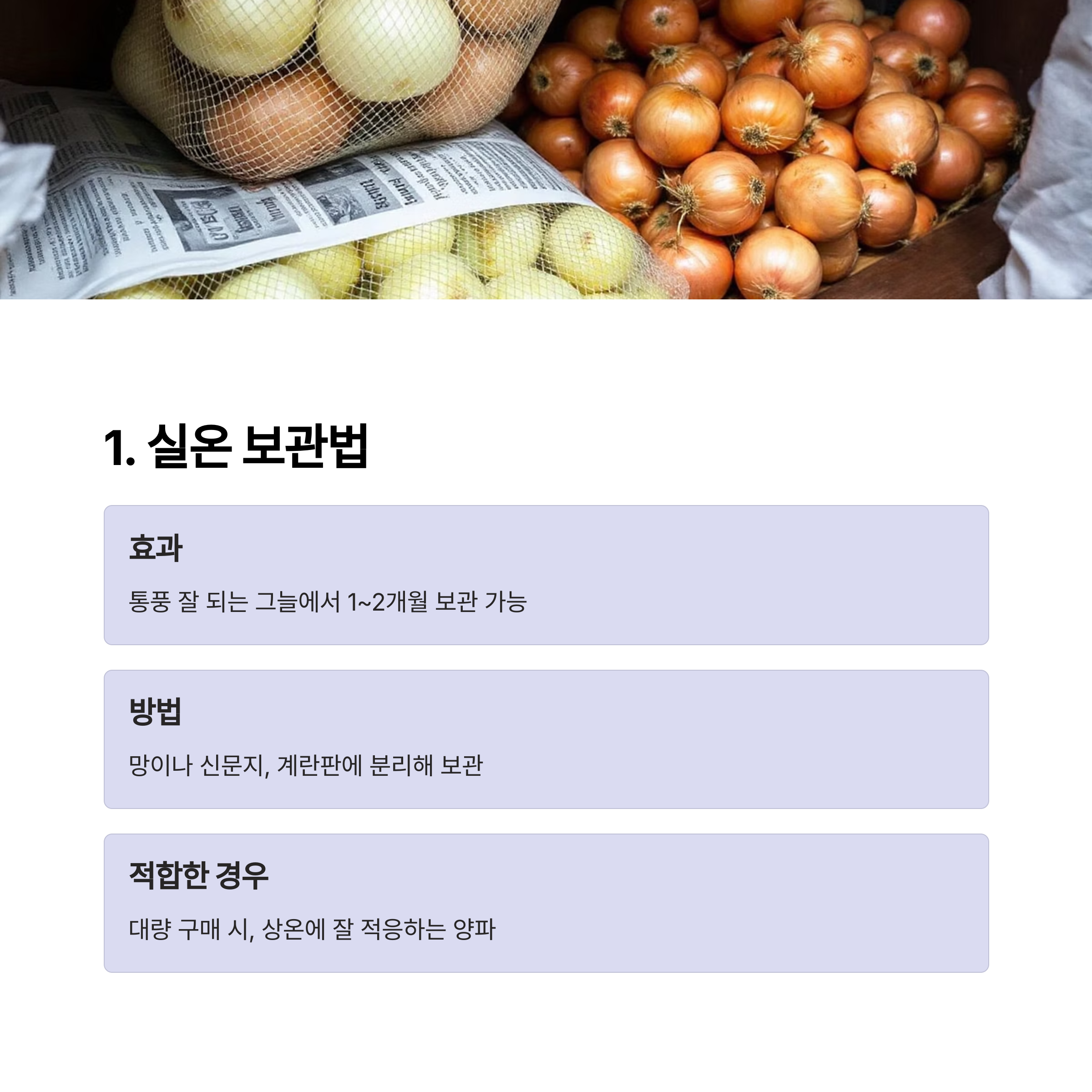 | 실온 보관 | 2~4주 | 통양파 보관 | 식감과 맛 유지 | 습도에 민감 |
