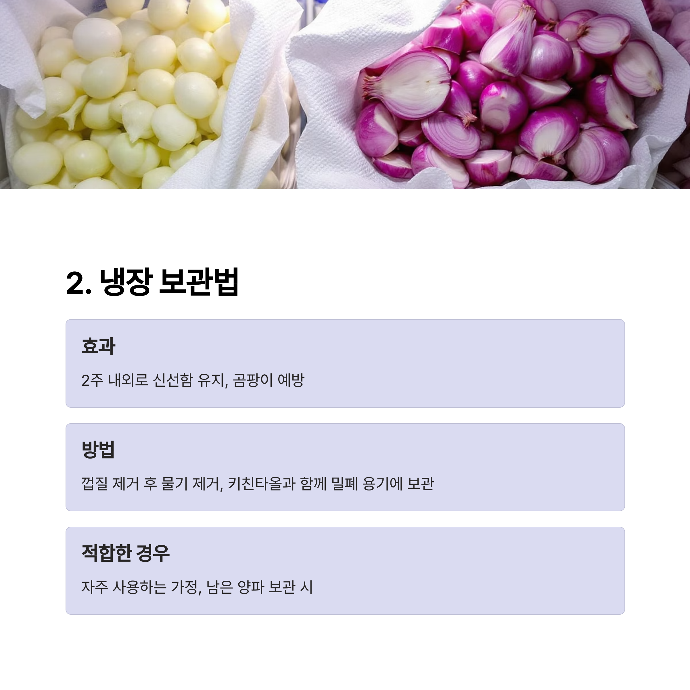 | 냉장 보관 | 1~2주 | 자른 양파 | 신선도 유지 | 냄새 전이 |