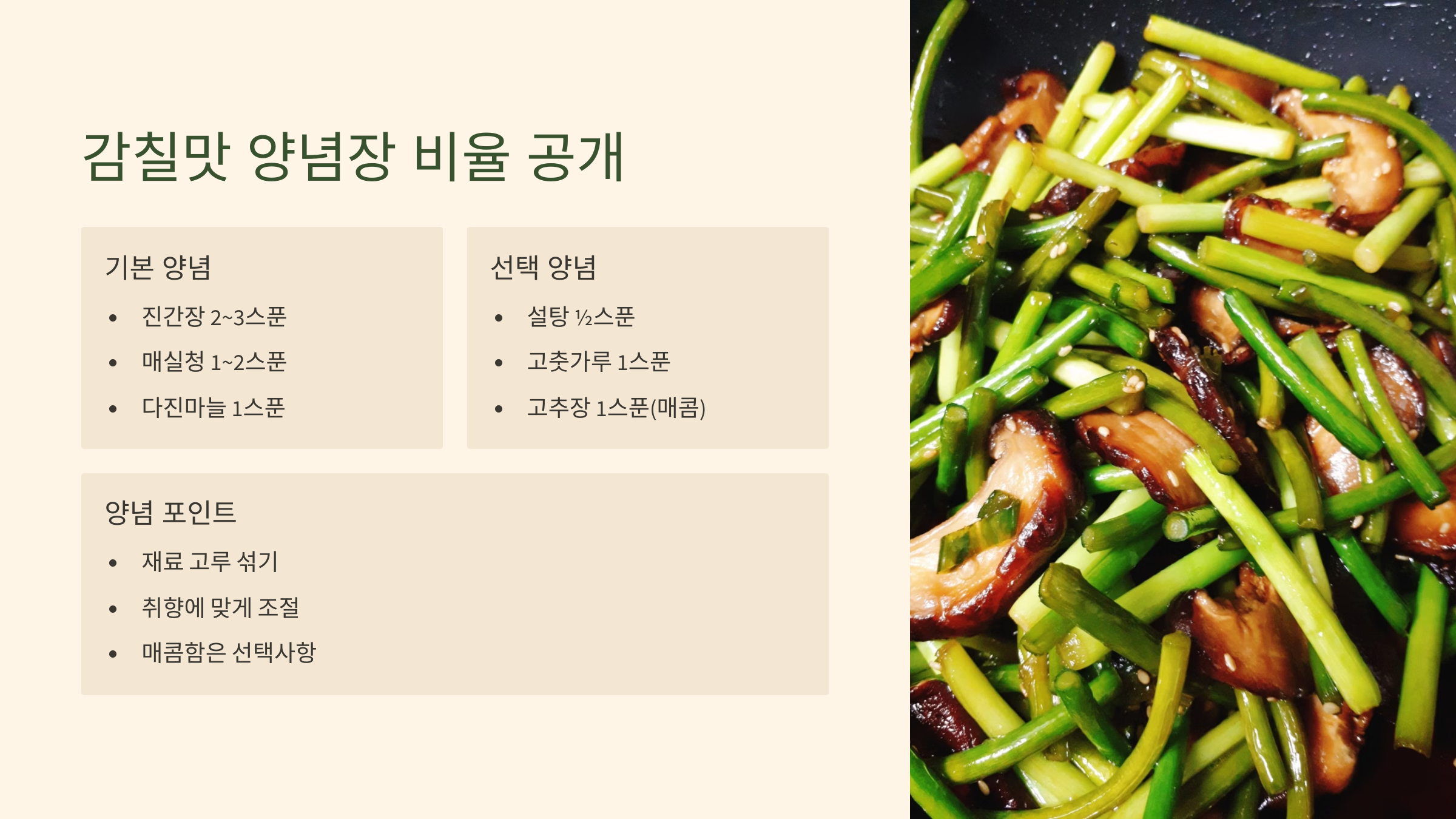💡 해결법: 기본 양념 외에 감칠맛을 더하고 싶다면 굴소스 1작은술을 추가해보세요. 또한, 마른 팬에 건새우 한 줌을 살짝 볶아 넣거나, 다진 마늘 1/2작은술을 마늘쫑과 함께 볶으면 풍미가 훨씬 좋아집니다. 매콤한 맛을 선호한다면 고춧가루 1/2~1작은술 또는 잘게 썬 청양고추를 활용해보세요.