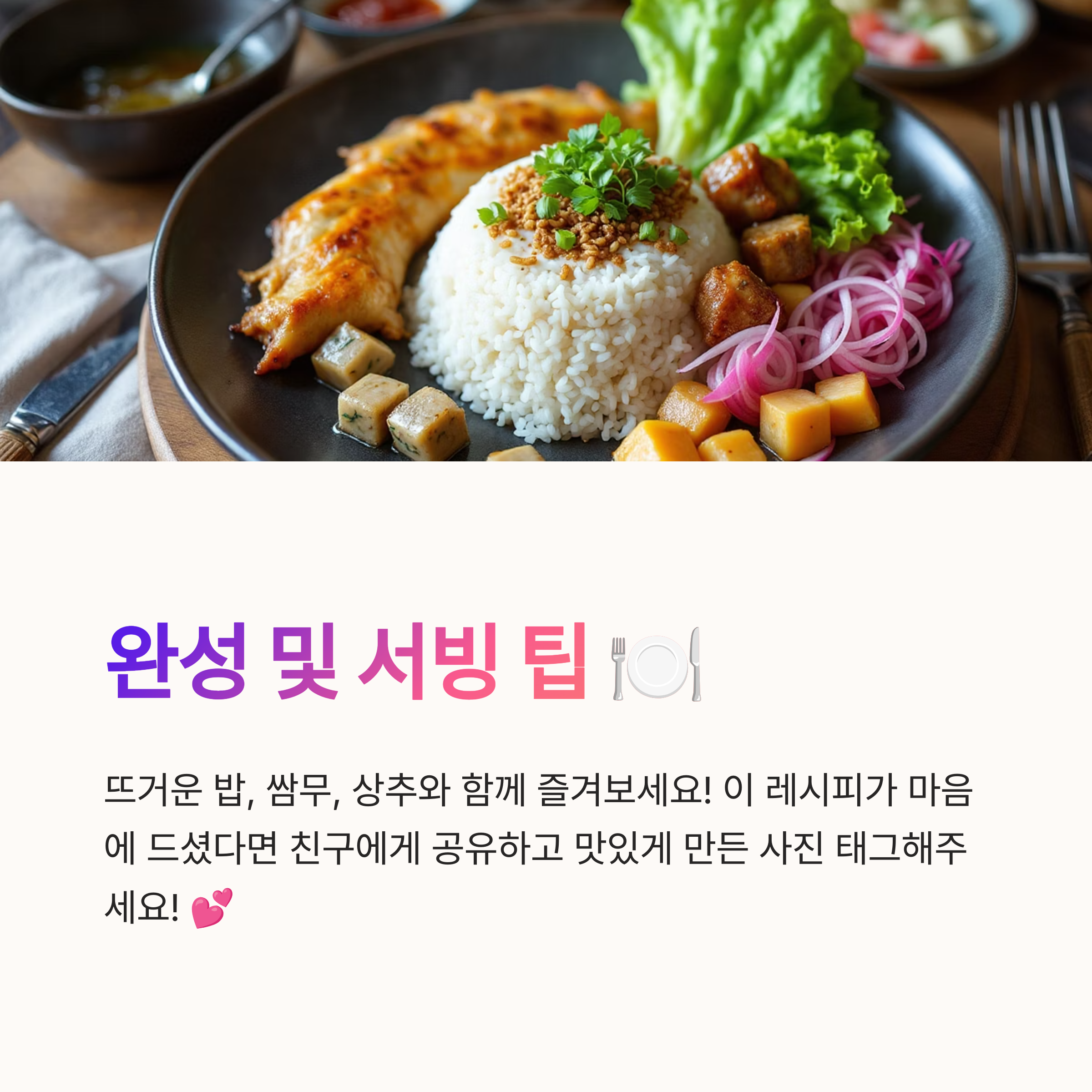 4. 맛있게 즐기기: 따끈한 밥 위에 올려 덮밥으로 먹거나, 쌈 채소와 함께 쌈밥으로 즐겨보세요! 🍚🥬