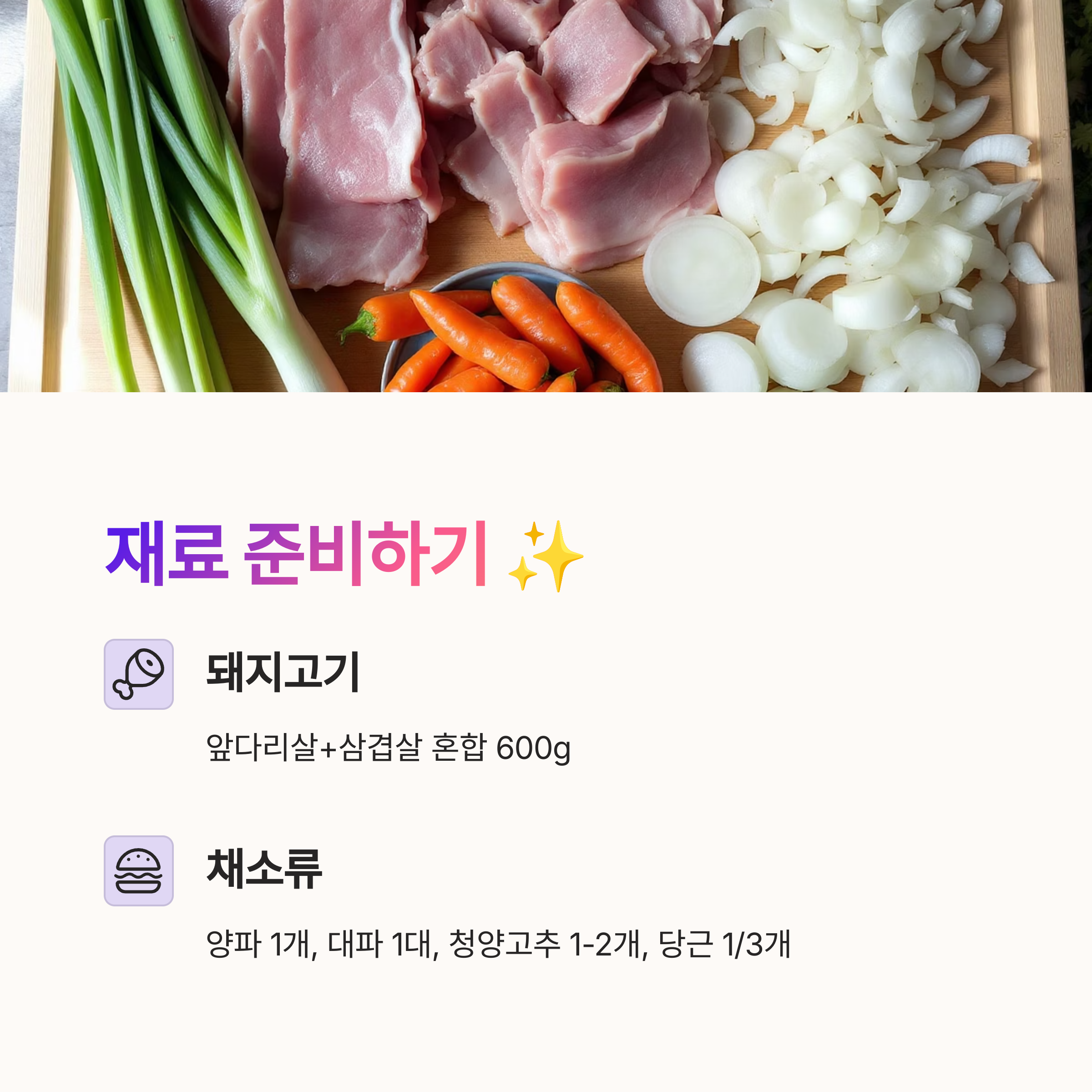 - 주재료: 돼지고기 앞다리살 또는 목살 600g (취향에 따라 삼겹살도 좋아요!), 양파 1개, 대파 1대, 청양고추 1-2개 (선택), 당근 약간 (선택)