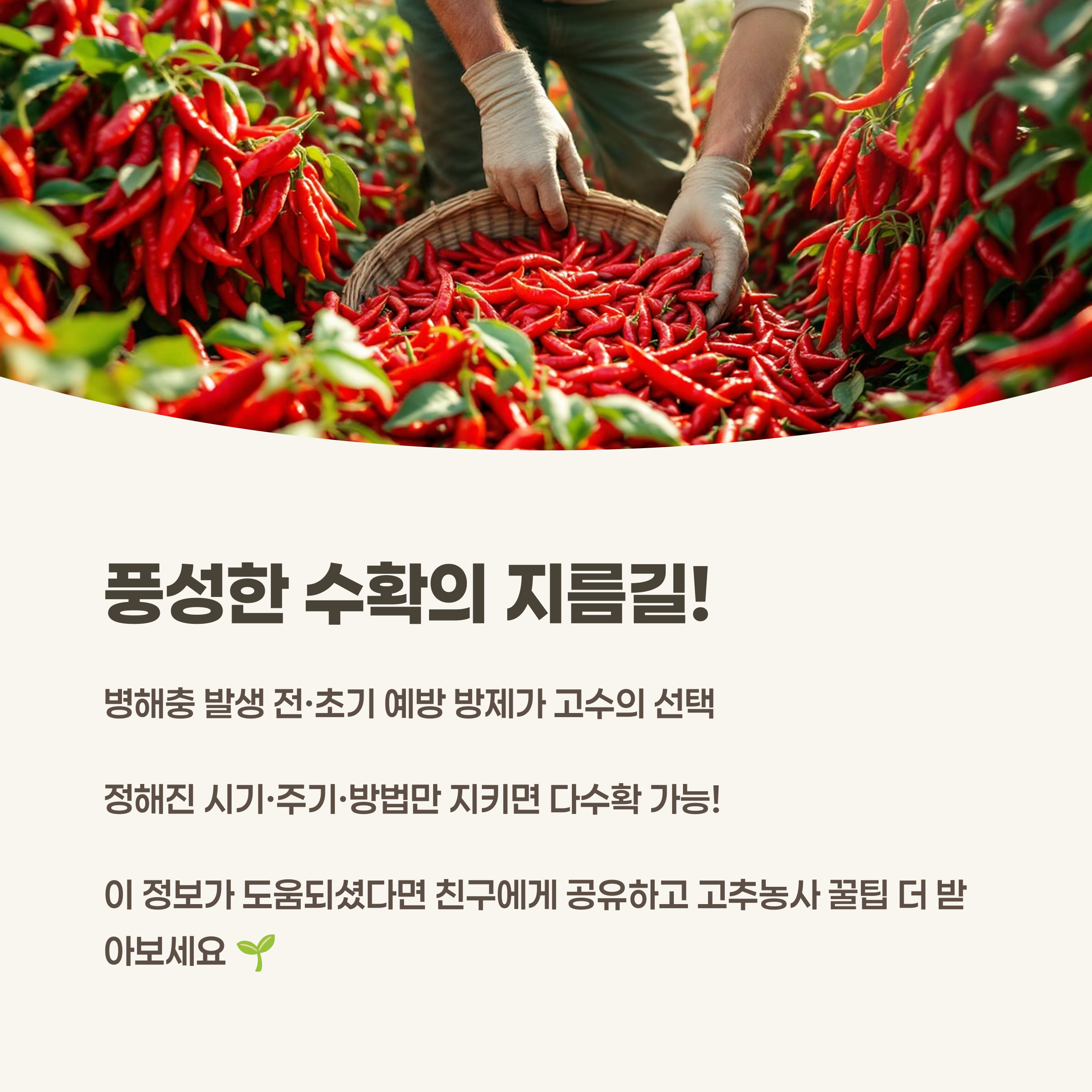 고추 약치는 시기를 적절히 관리하는 것은 고추 농사의 성패를 좌우하는 핵심 요소입니다. 병해충 발생 시기, 날씨 조건, 고추의 생육 단계를 고려하여 최적의 약제 처리 일정을 계획하세요. 예방 중심의 약제 처리와 함께 친환경적인 방법도 적절히 병행한다면 더욱 건강하고 풍성한 고추 수확을 기대할 수 있습니다.