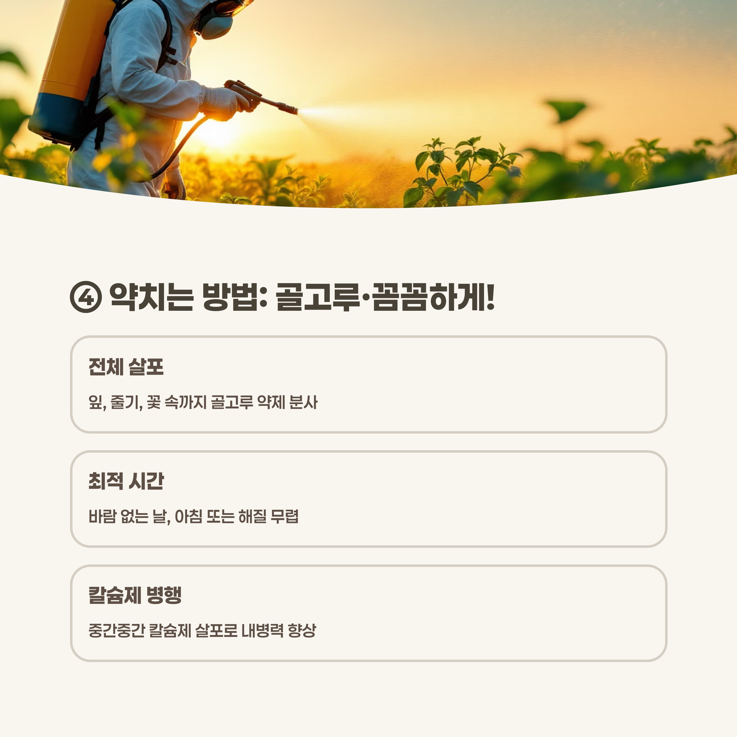 - 치료 약제: 병해충 발생 확인 시 즉시 살포 후 5~7일 간격으로 2~3회 추가 살포