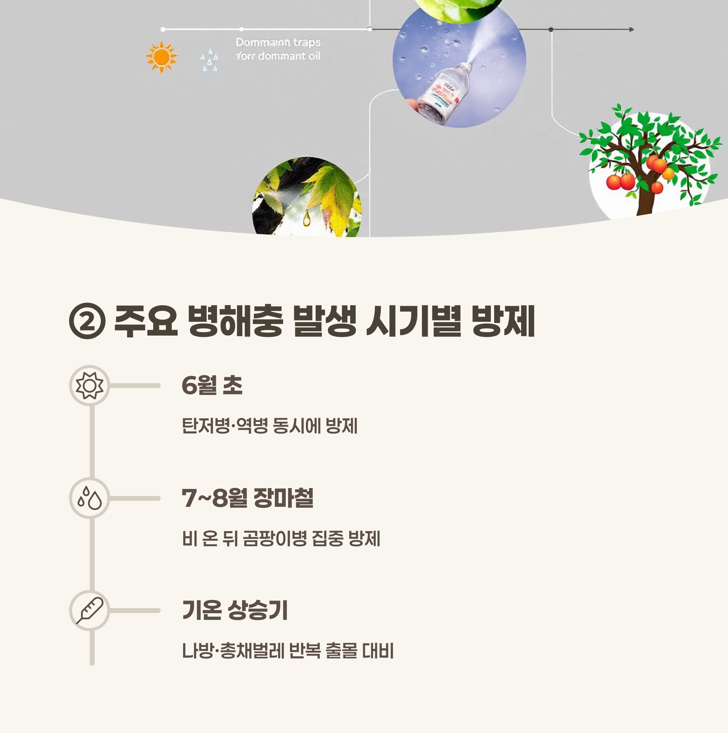 | 탄저병 | 7월~9월 고온다습기 | 과실 형성기, 비 온 후 즉시 |