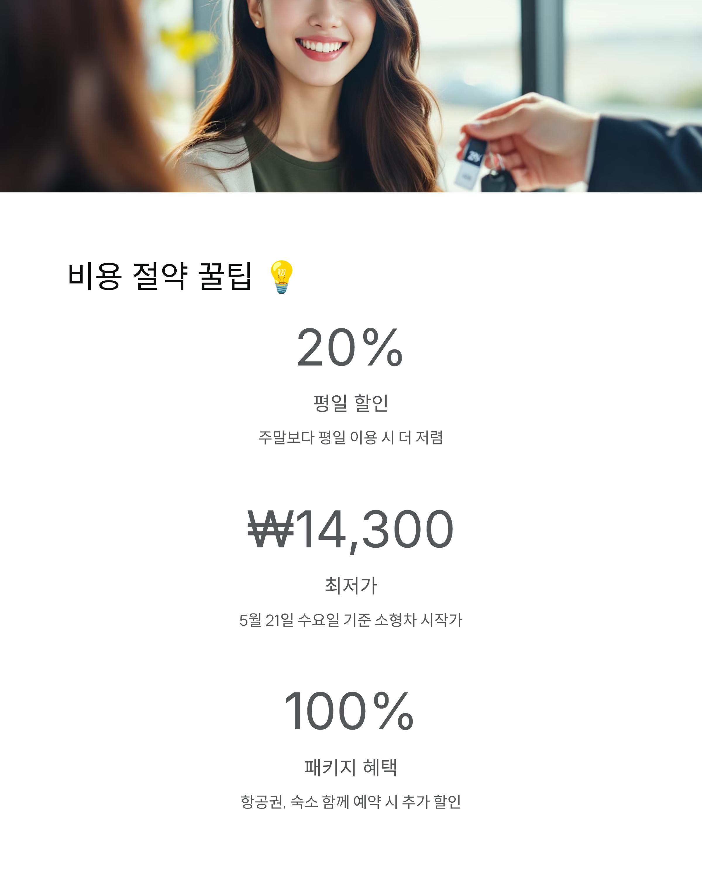 - 차량 연식: 1~2년 이내의 신차를 선택하면 안전하고 쾌적한 여행이 가능합니다.