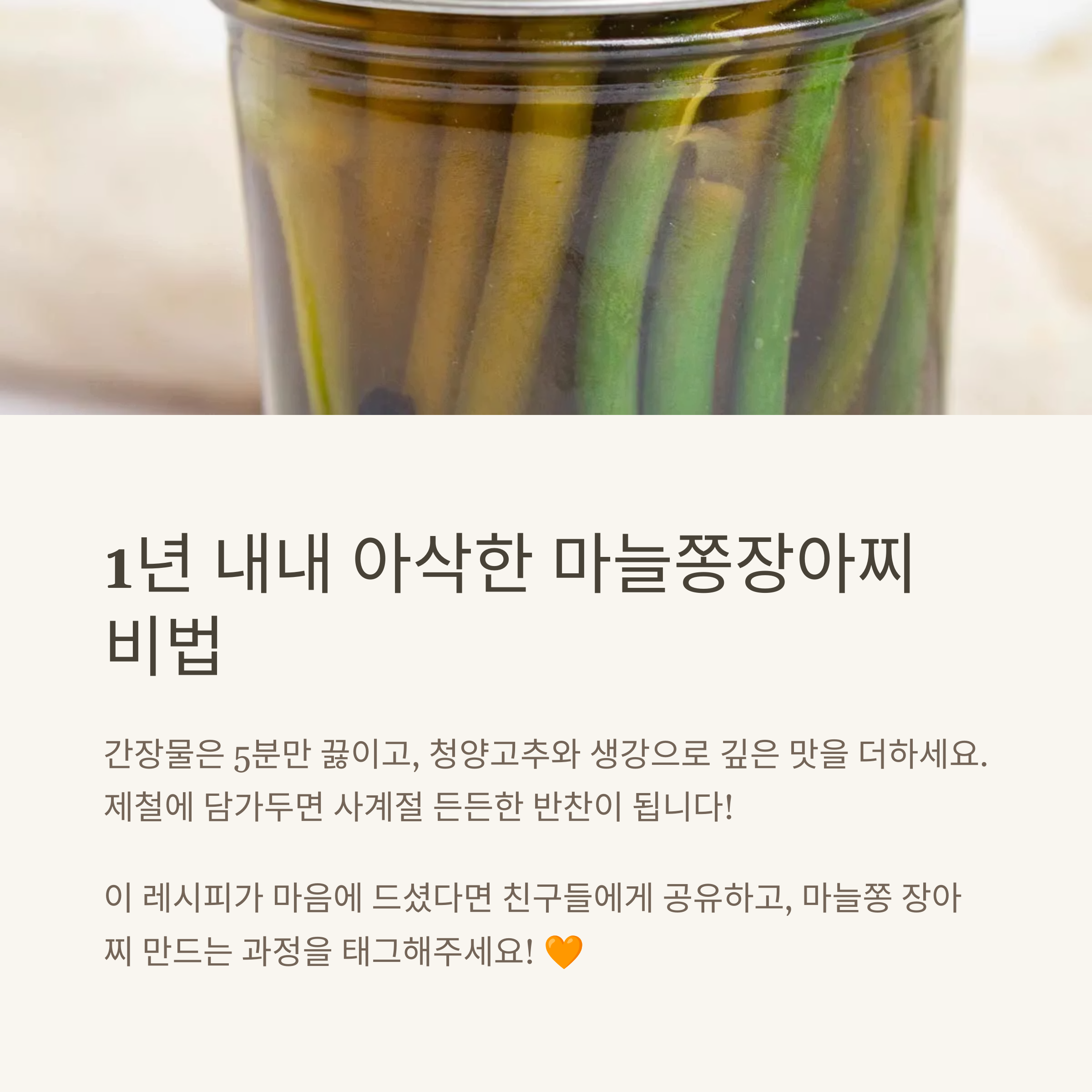 이제 마늘쫑장아찌 맛있게 담그는법을 알았으니, 다가오는 봄에 신선한 마늘쫑을 구해 직접 장아찌를 담가보는 건 어떨까요? 집에서 만든 건강한 발효식품으로 가족의 건강도 챙기고, 맛있는 밑반찬도 즐겨보세요! 🥘
