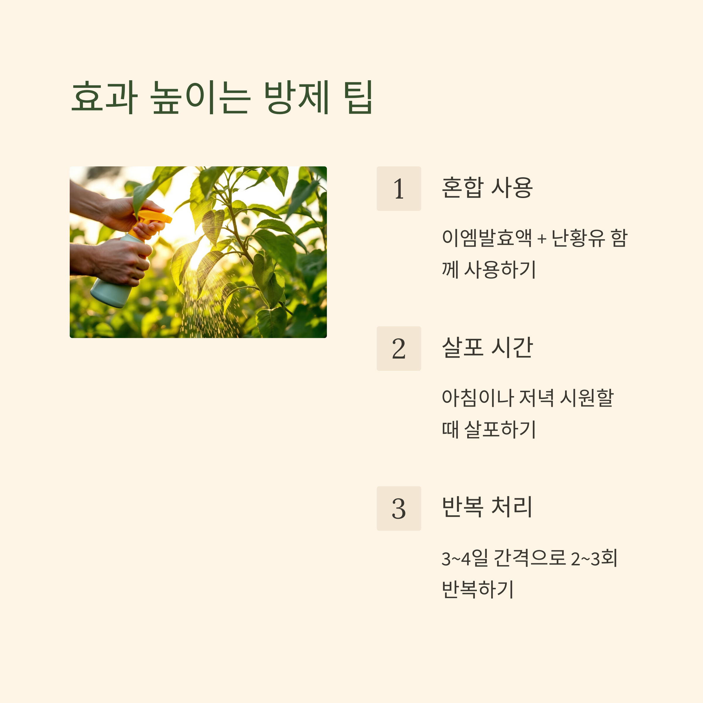 -주 2~3회 반복하면 진딧물 개체수를 크게 줄일 수 있습니다.