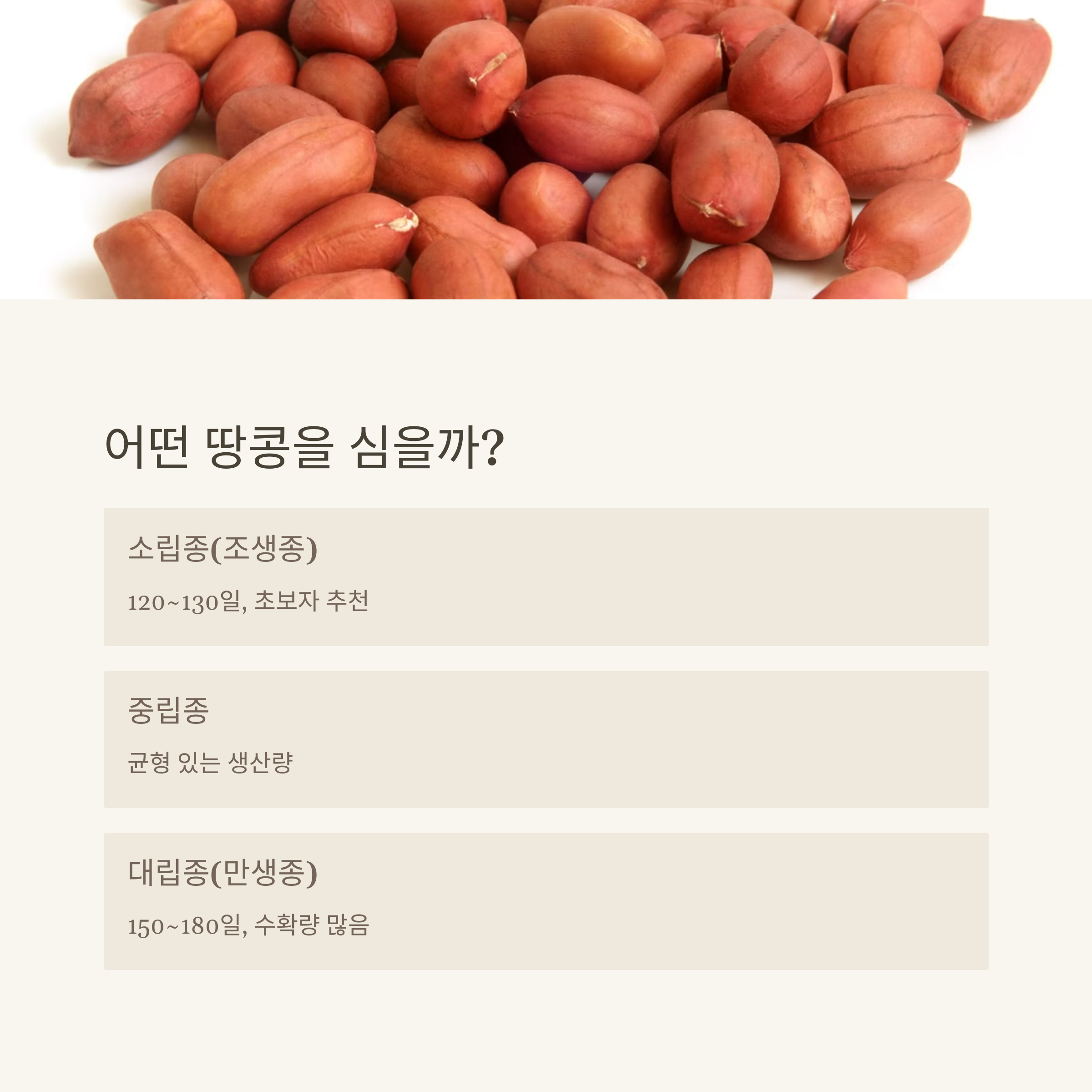 땅콩 품종은 생육기간과 특성에 따라 소립종(조생종), 중립종, 대립종(만생종)으로 나뉘어요.