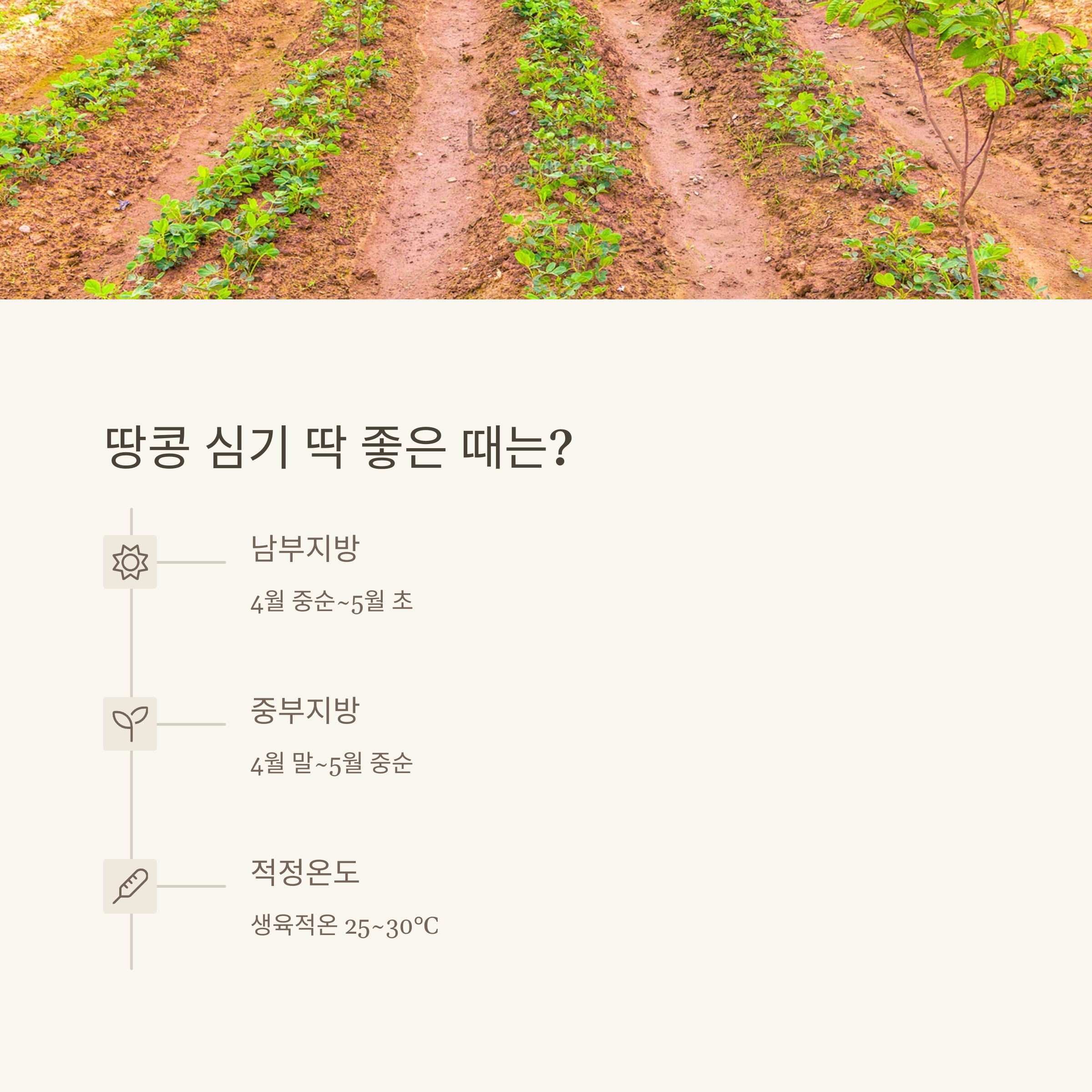땅콩 심는시기는 지역 기온에 따라 달라져요. 늦서리를 피해 최저 15℃ 이상일 때 심는 게 좋아요.