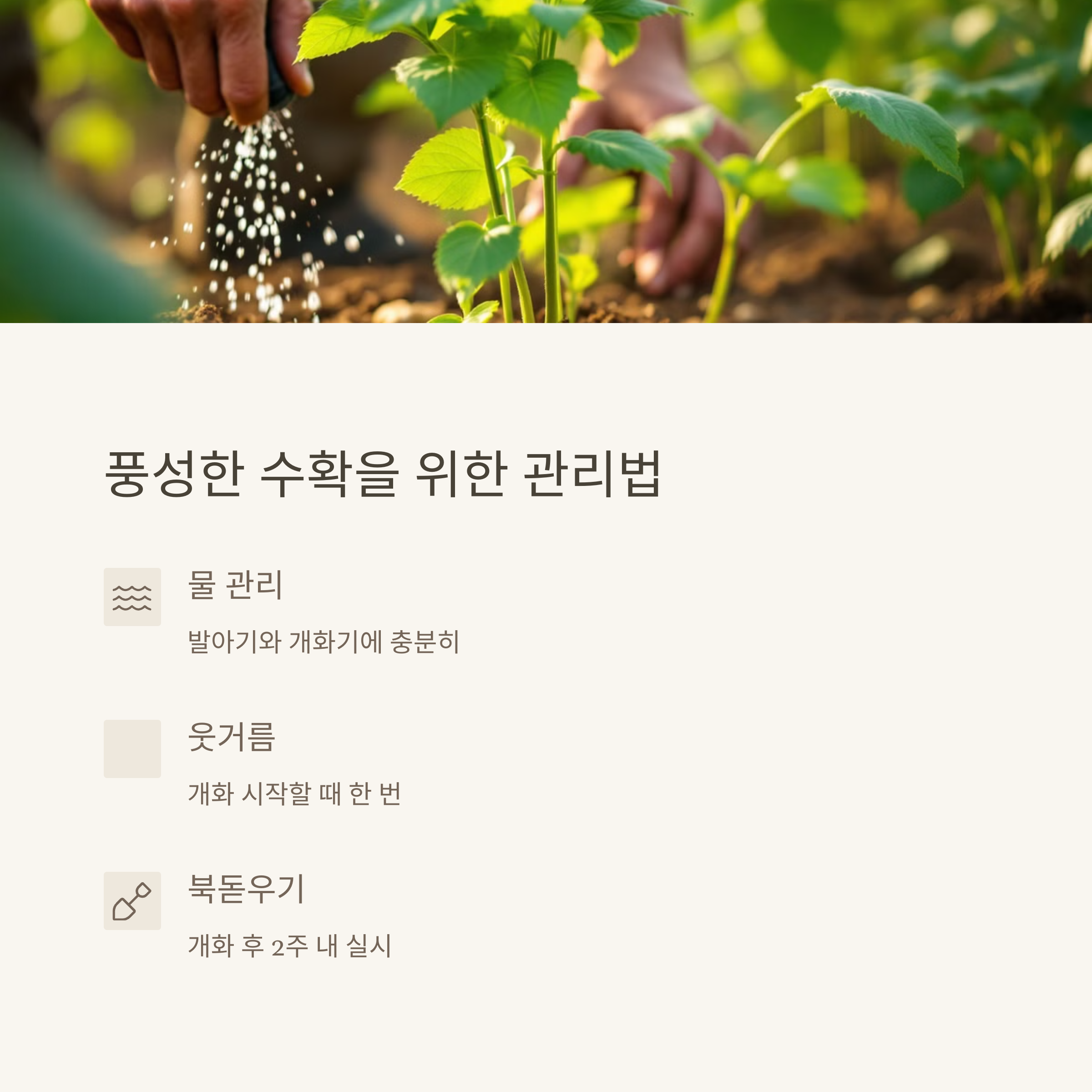 심은 후에는 북주기가 핵심이에요. 꽃이 피기 전(6월 초)과 개화 후(7월 초), 두 번 흙을 5~7cm 덮어주세요.