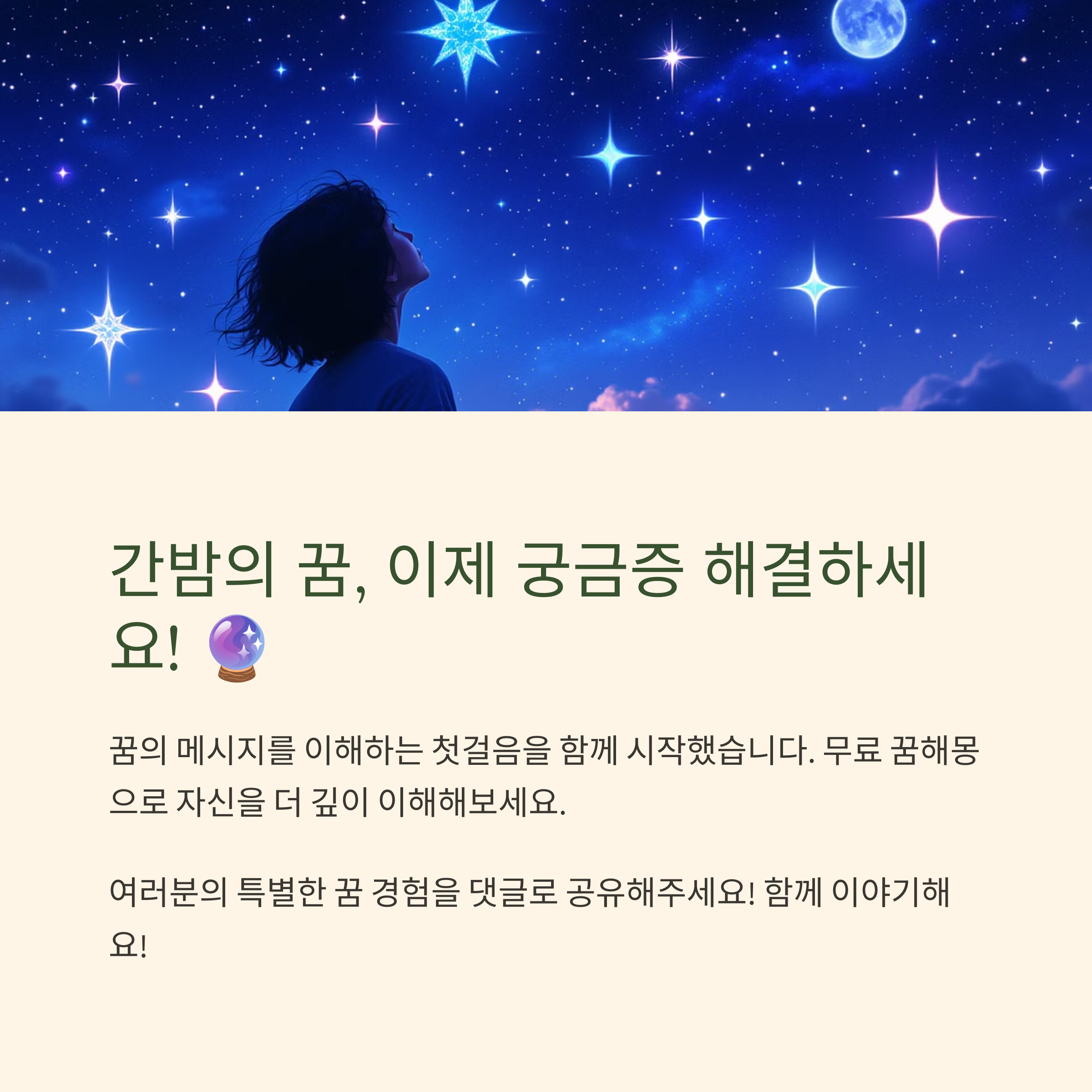꿈은 우리의 무의식이 보내는 신비로운 편지와도 같습니다. 무료 꿈해몽 풀이는 그 편지를 읽어보는 하나의 방법일 뿐, 꿈을 해석하는 가장 중요한 열쇠는 바로 자기 자신에게 있습니다. 오늘 밤, 좋은 꿈 꾸시고 꿈을 통해 자신을 더 깊이 이해하는 즐거운 경험을 하시길 바랍니다! 😴✨