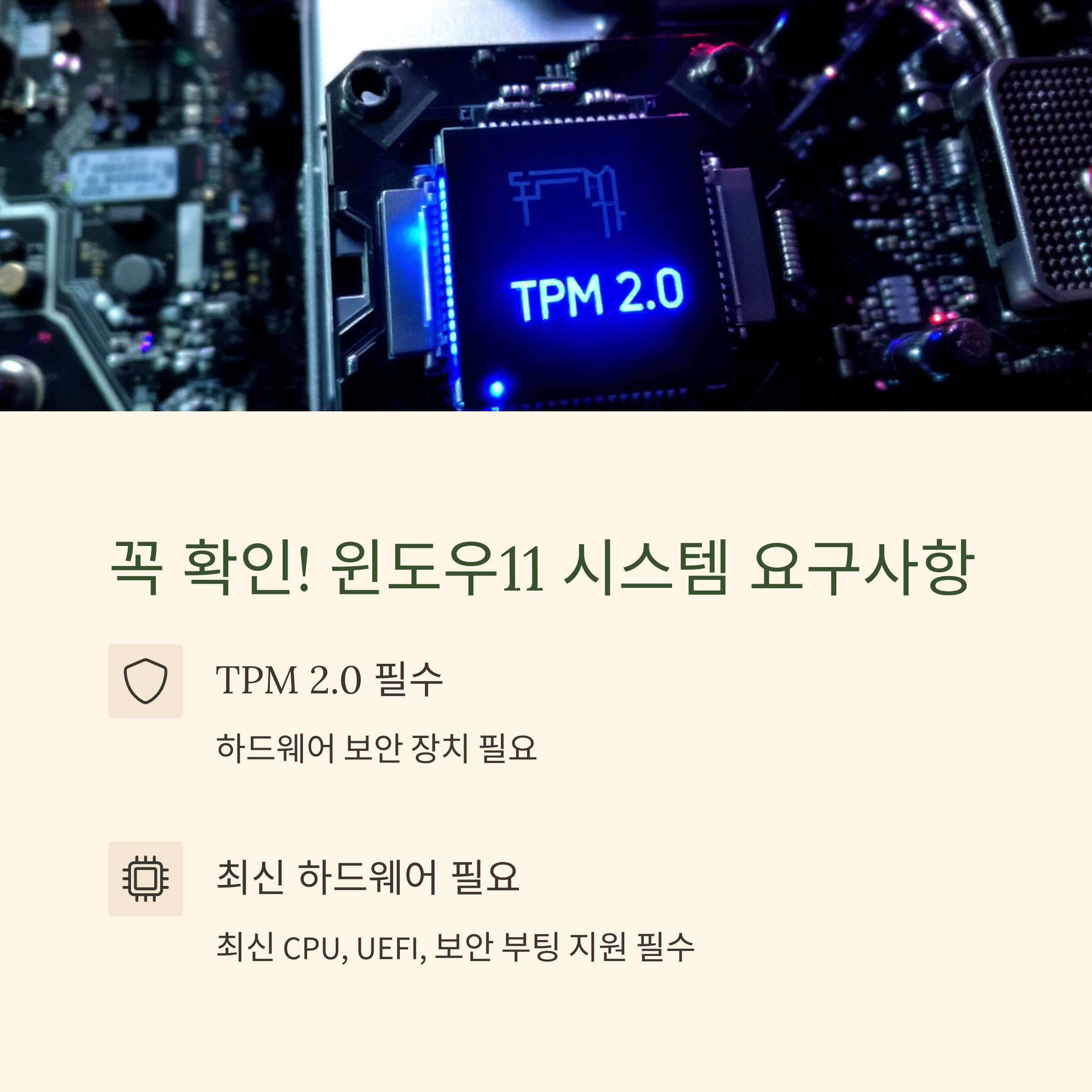 윈도우11 무료 업데이트를 진행하기 전 PC가 위 요구사항을 충족하는지 확인해야 합니다. 특히 TPM 2.0과 보안 부팅이 가장 많은 호환성 문제를 일으키는 부분입니다. 마이크로소프트는 PC 상태 확인 도구를 제공하고 있으니, 업데이트 전 반드시 호환성 점검을 진행하세요.