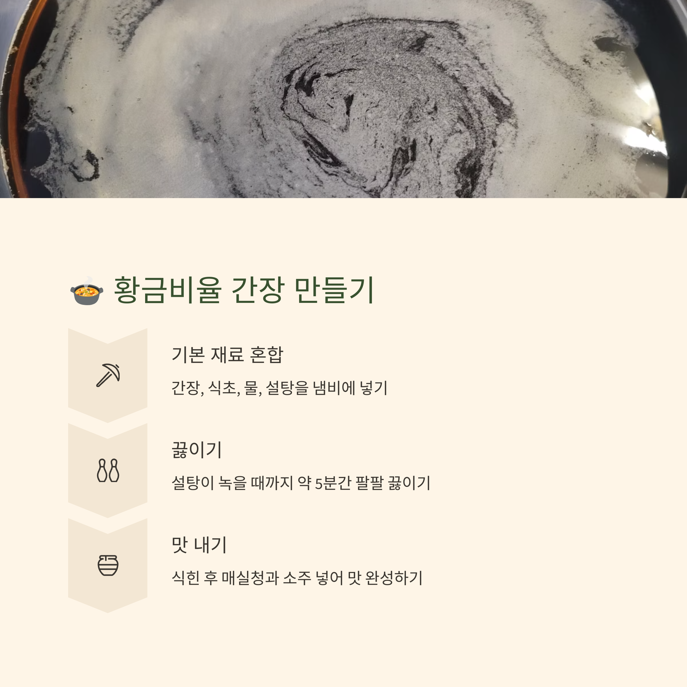 위의 간장, 설탕, 식초, 물 비율인 1:1:1:1은 가장 기본적이면서도 맛을 보장하는 황금비율이에요. 단맛이나 신맛은 취향에 따라 조금씩 조절하셔도 좋습니다.