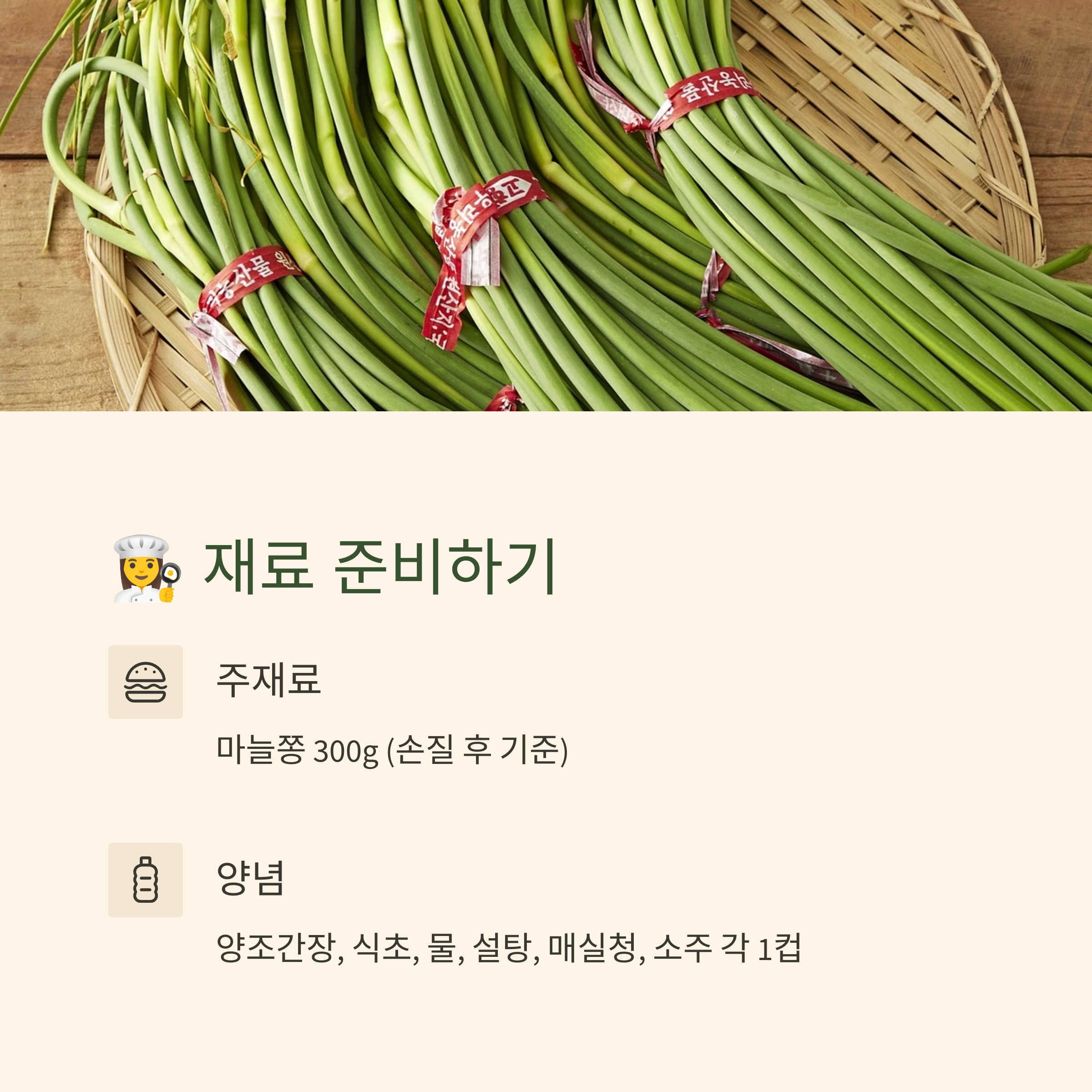 | 마늘쫑 | 300g (한 단 정도) | 싱싱하고 너무 굵지 않으며, 전체적으로 윤기가 도는 것 |