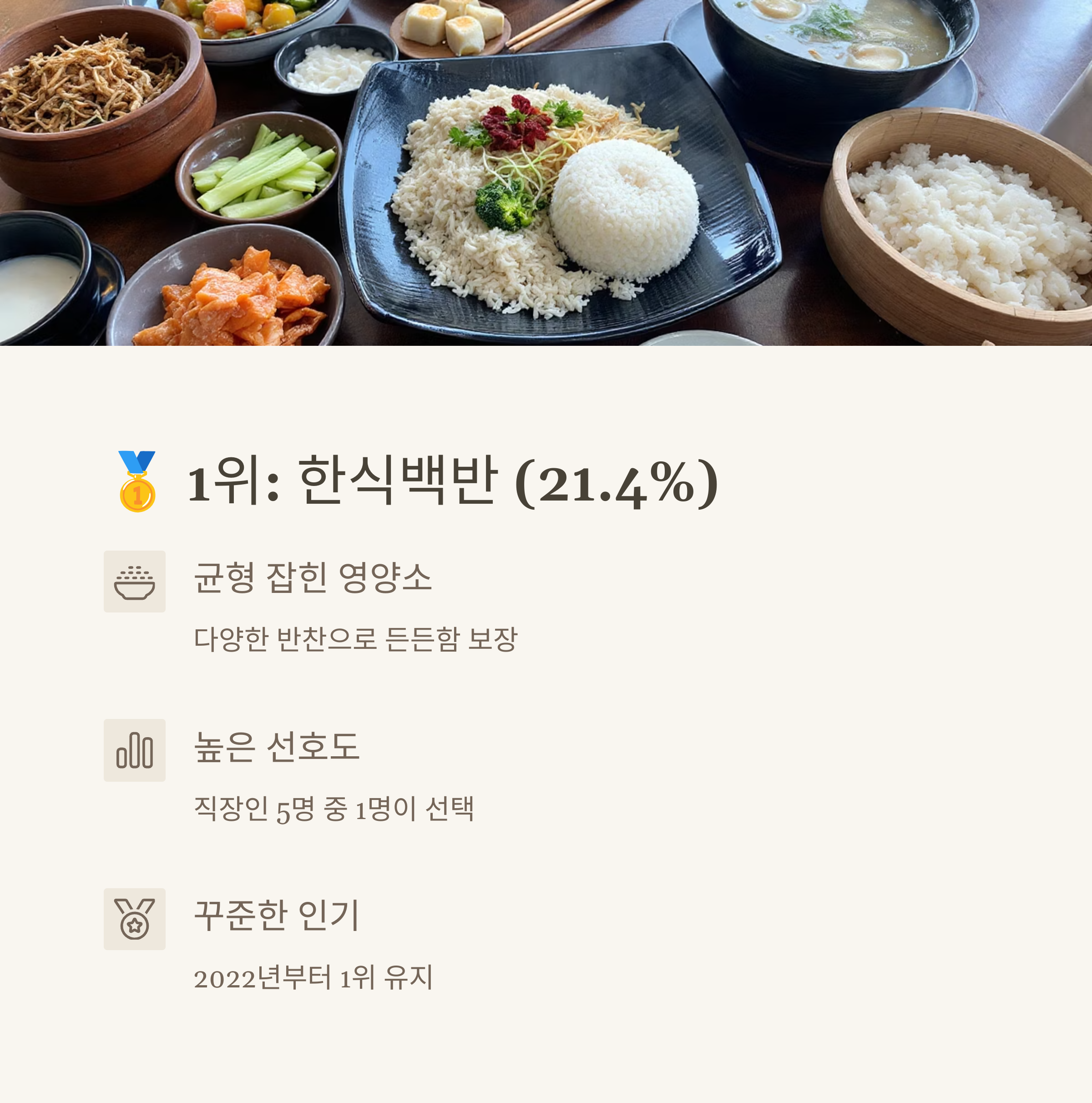 역시 '밥심'을 중요하게 생각하는 한국 직장인들에게는 든든한 한식 메뉴가 여전히 강세네요! 여러분의 최애 점심메뉴 추천도 이 안에 있나요?