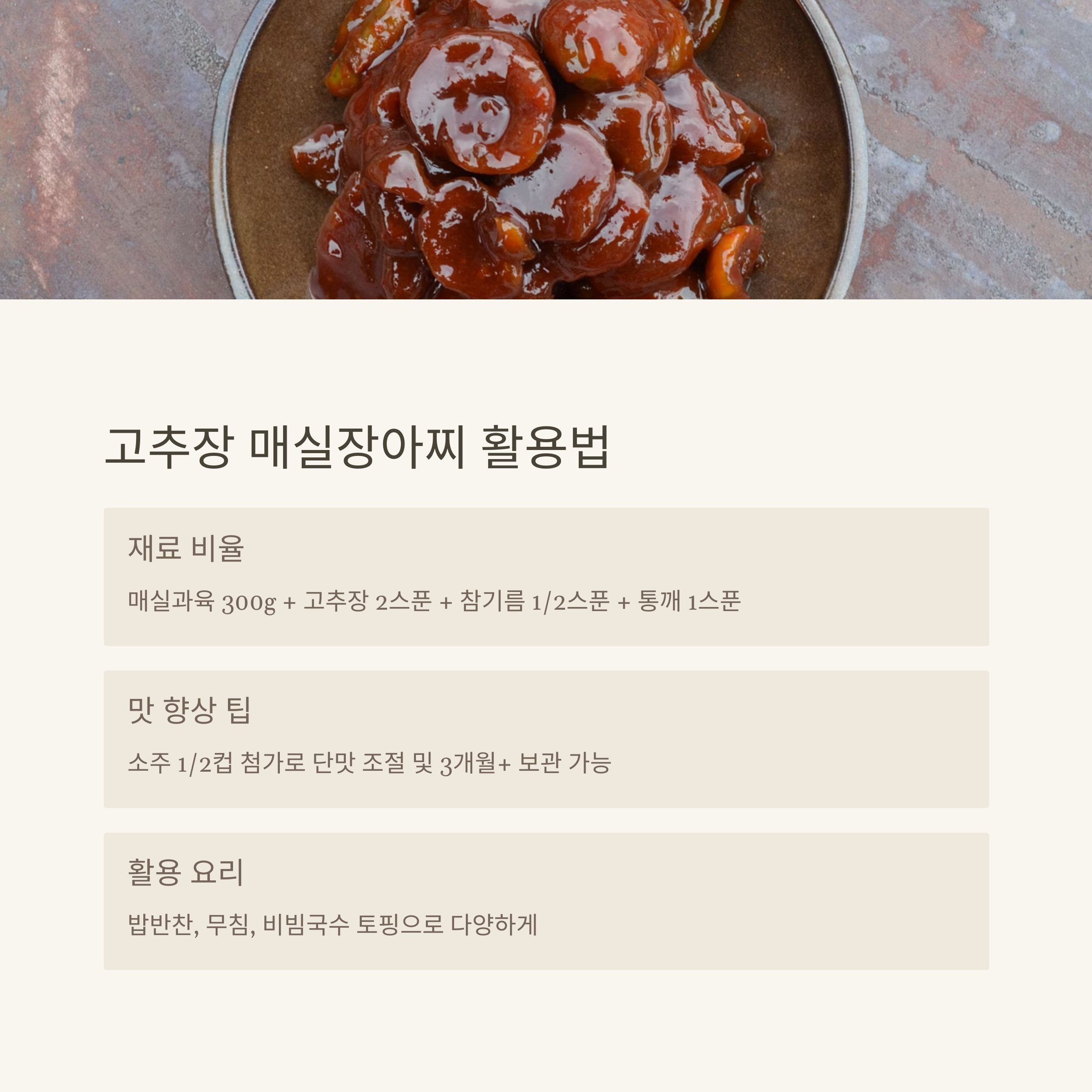 뿐만 아니라 어떤 재료가 들어갔는지 내 눈으로 직접 확인하니 온 가족이 안심하고 먹을 수 있죠. 정성껏 만든 매실장아찌 하나면 입맛 없는 여름철에도 밥 한 그릇 뚝딱! 든든한 밥도둑이 되어줄 거예요.