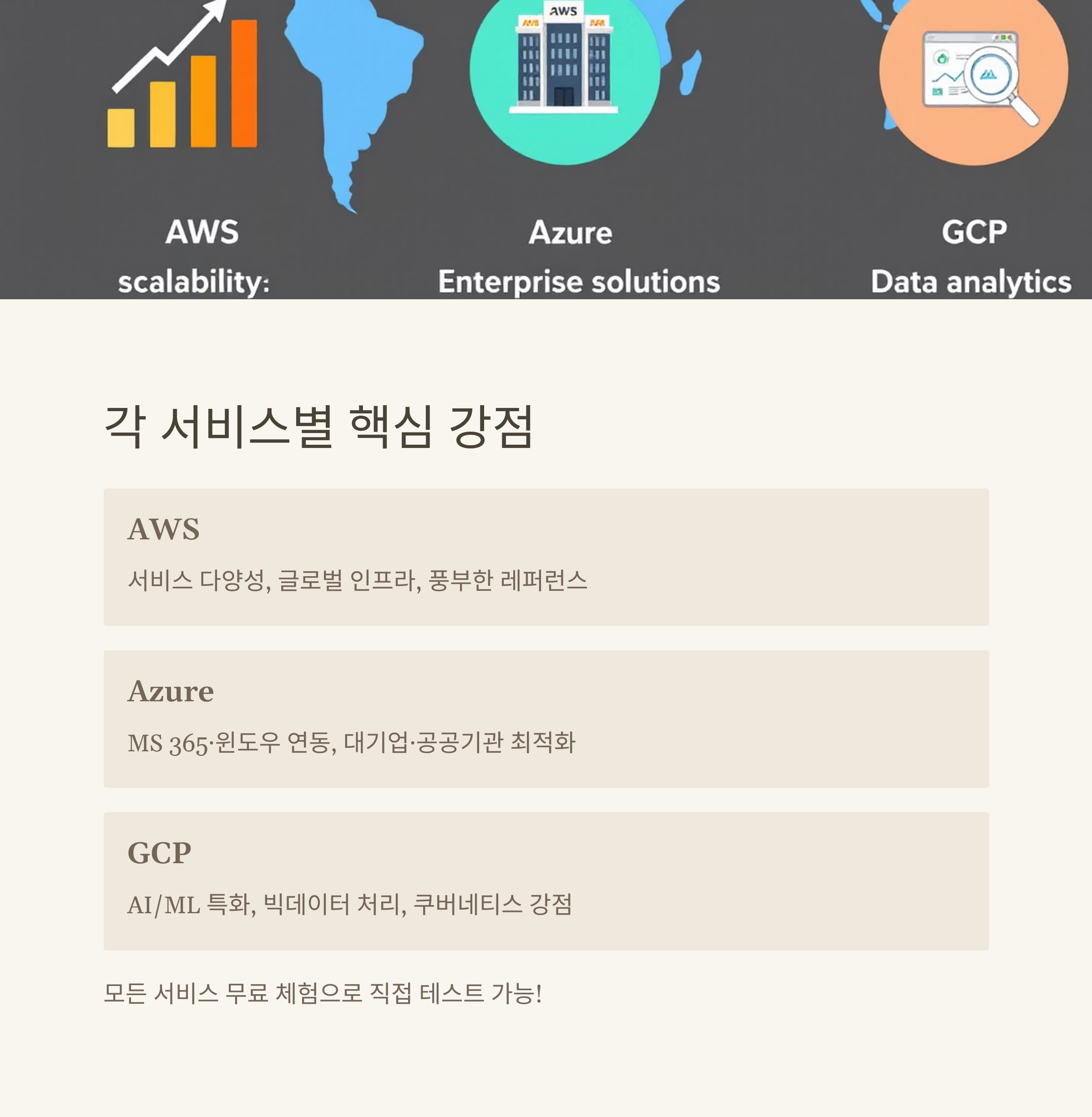 | 주요 특징 | 가장 폭넓은 서비스 포트폴리오, 강력한 생태계, 높은 안정성 | MS 제품과의 뛰어난 연동성, 하이브리드 클라우드 강점, 엔터프라이즈 친화적 | 데이터 분석, AI/ML, Kubernetes 기술 선도, 혁신적인 기술, 합리적 비용 |