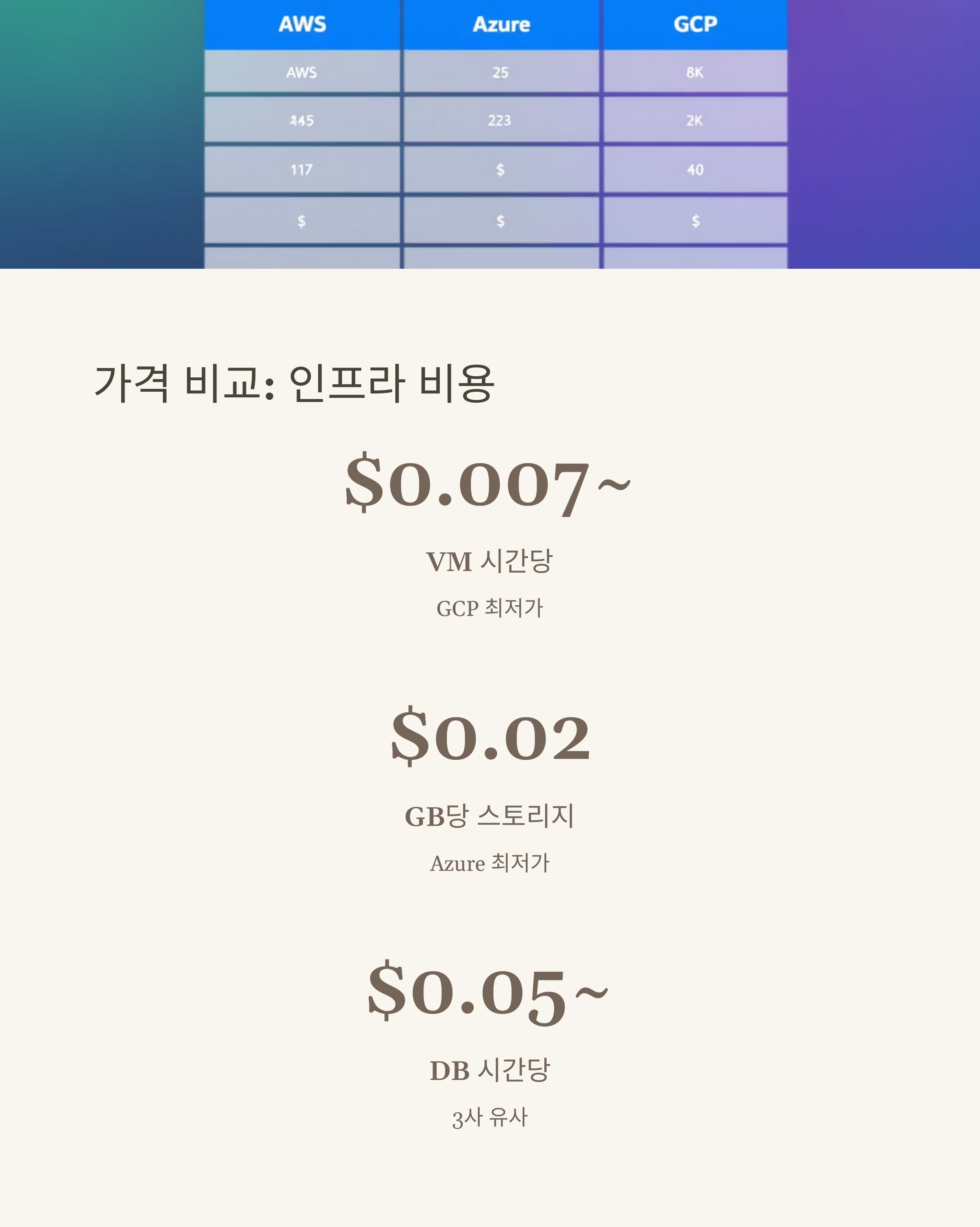 | 가격 정책 | 다양한 요금 모델 (온디맨드, 예약 인스턴스, 스팟 인스턴스 등), 다소 복잡할 수 있음 | 유연한 요금제, 기존 MS 라이선스 활용 시 할인 (Azure Hybrid Benefit) | 초 단위 과금, 지속 사용 할인, 선결제 할인 등 경쟁력 있는 가격 |