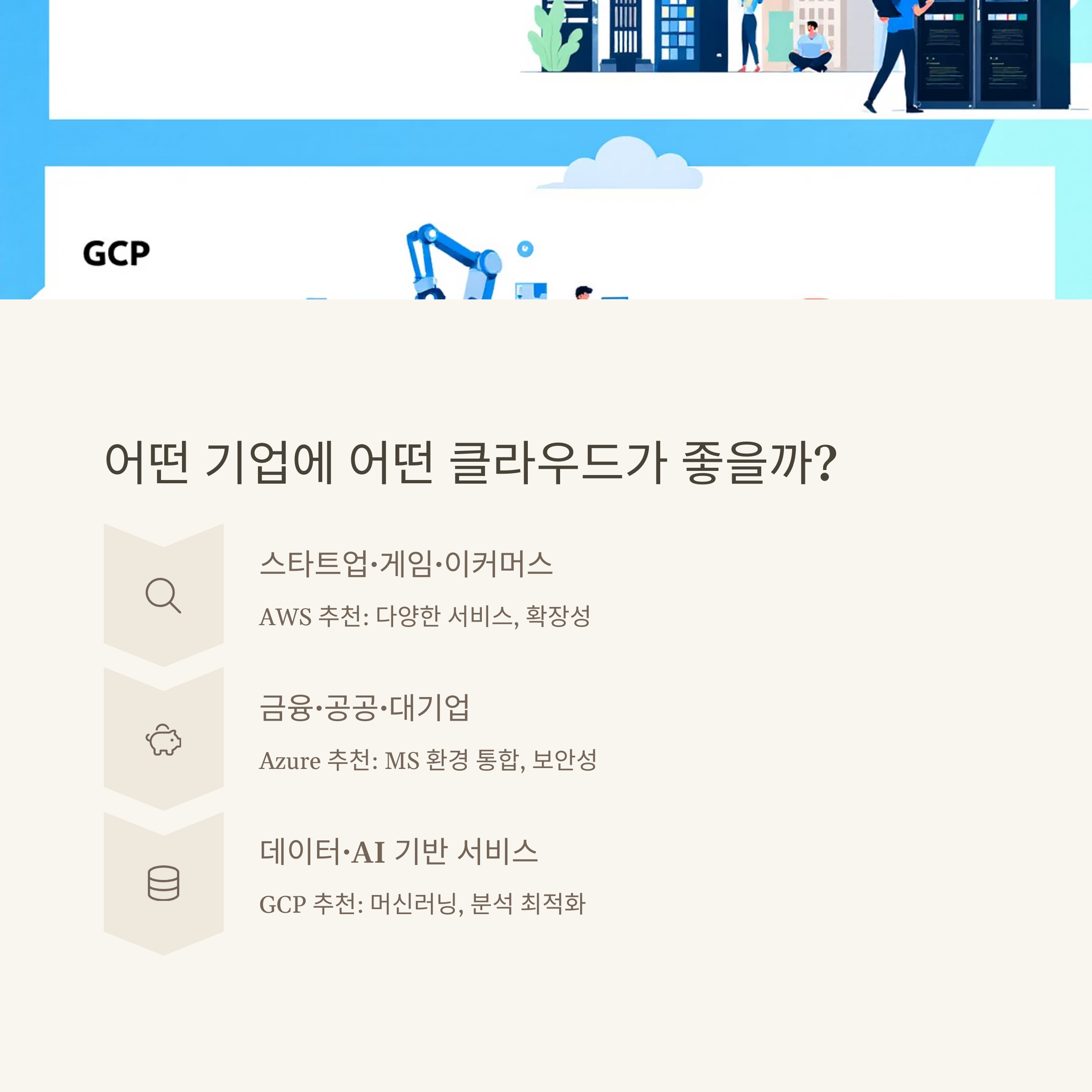 A. 스타트업의 경우 초기 비용 부담이 적고 빠른 확장이 가능한 GCP나 AWS의 특정 서비스를 고려해볼 수 있습니다. 중소기업은 기존 인프라와의 호환성 및 관리 용이성을 중시한다면 Azure가 좋은 선택이 될 수 있습니다.