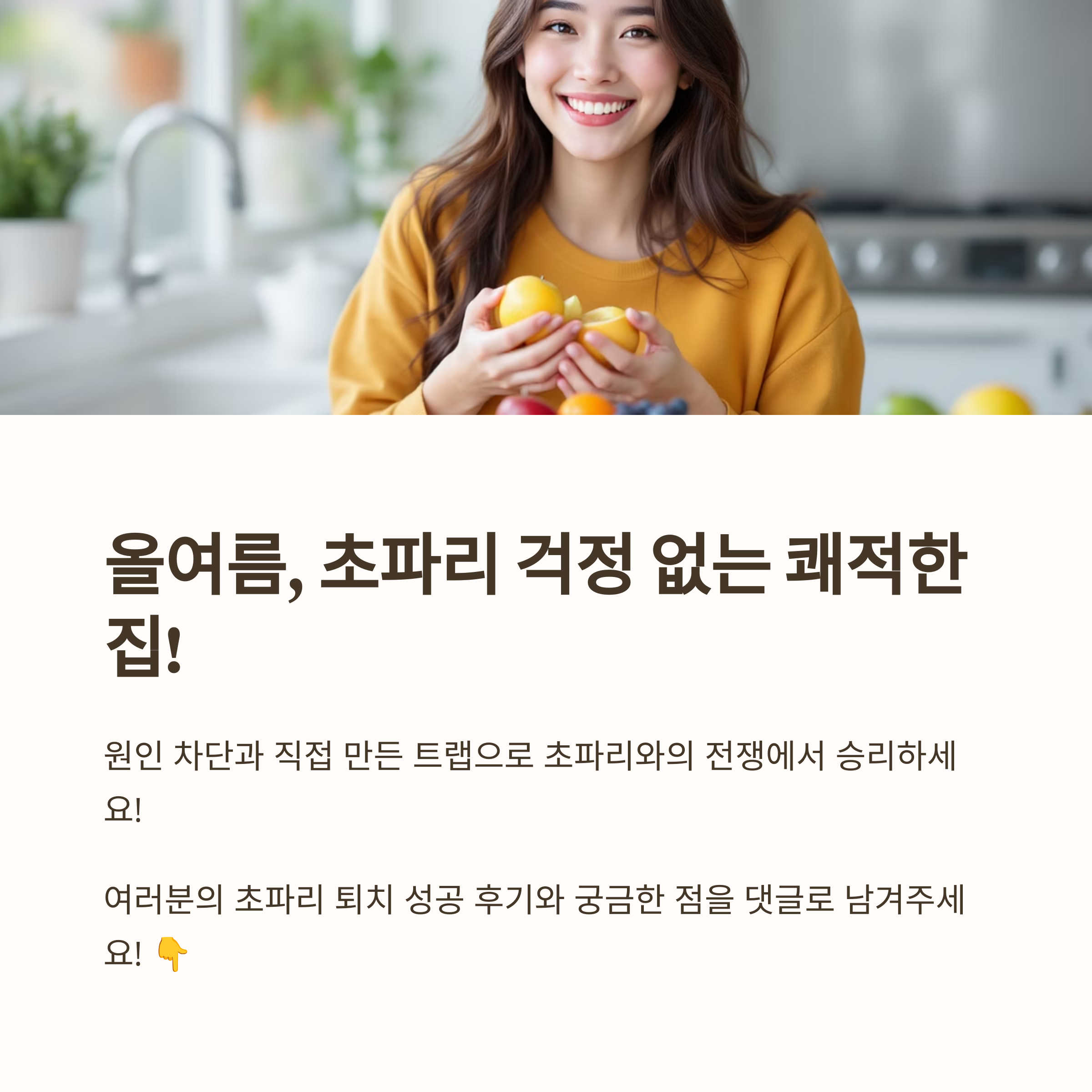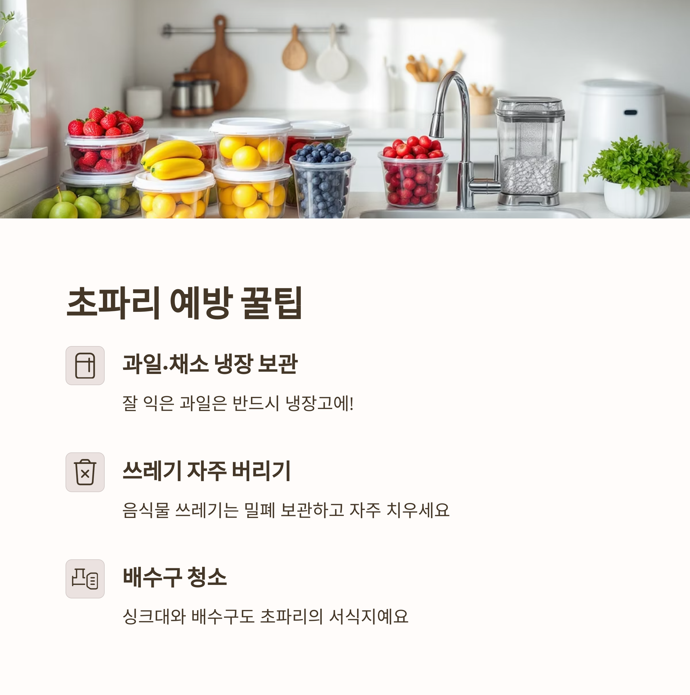 가장 좋은 방법은 초파리가 아예 생기지 않도록 미리 예방하는 거예요. 몇 가지만 신경 쓰면 훨씬 쾌적한 여름을 보낼 수 있답니다.