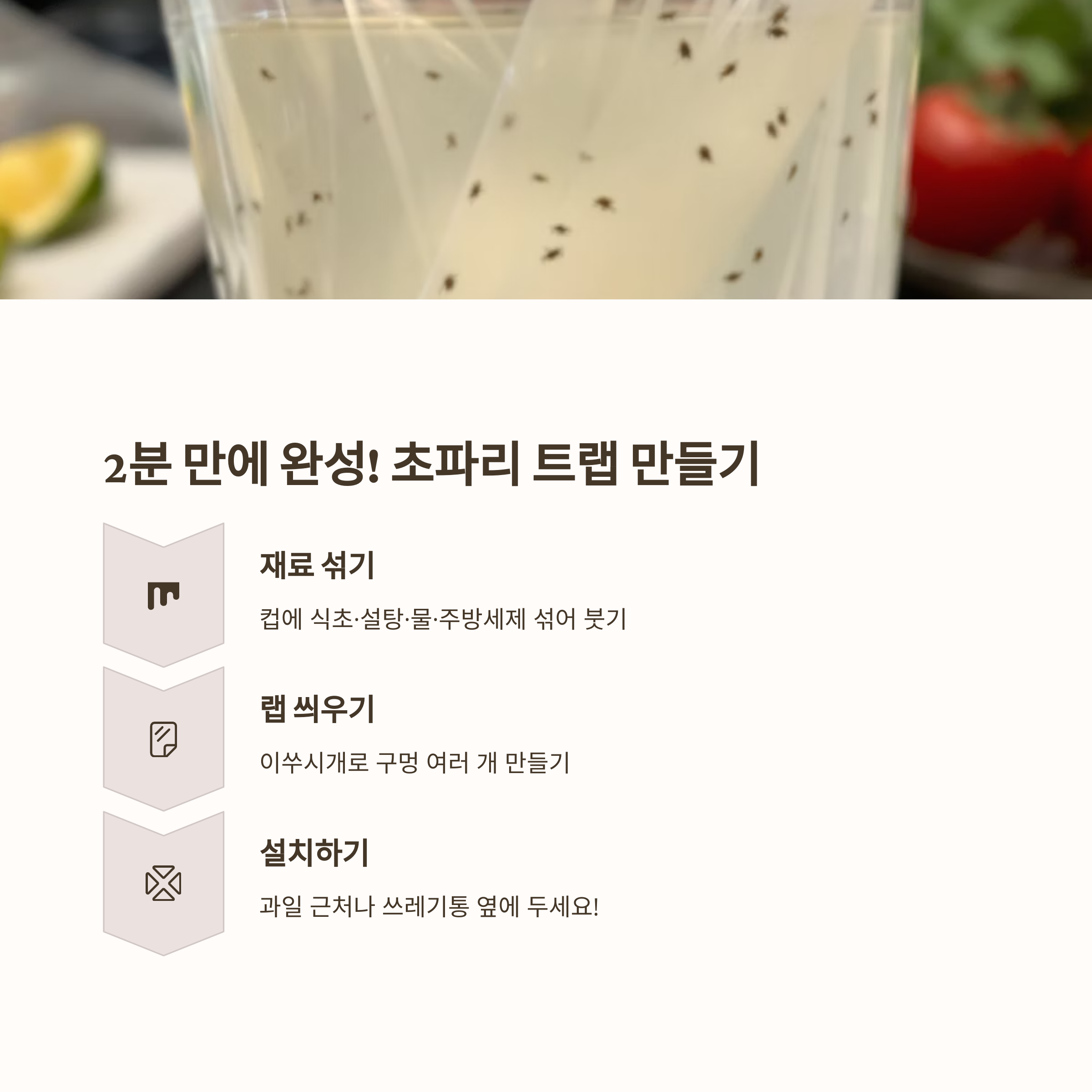 | 종이컵 트랩 | 종이컵, 랩, 이쑤시개, 유인액(식초+설탕+주방세제 약간) | 종이컵에 유인액을 1/3 정도 채우고 랩으로 씌운 뒤, 이쑤시개로 작은 구멍을 여러 개 뚫어주세요. |