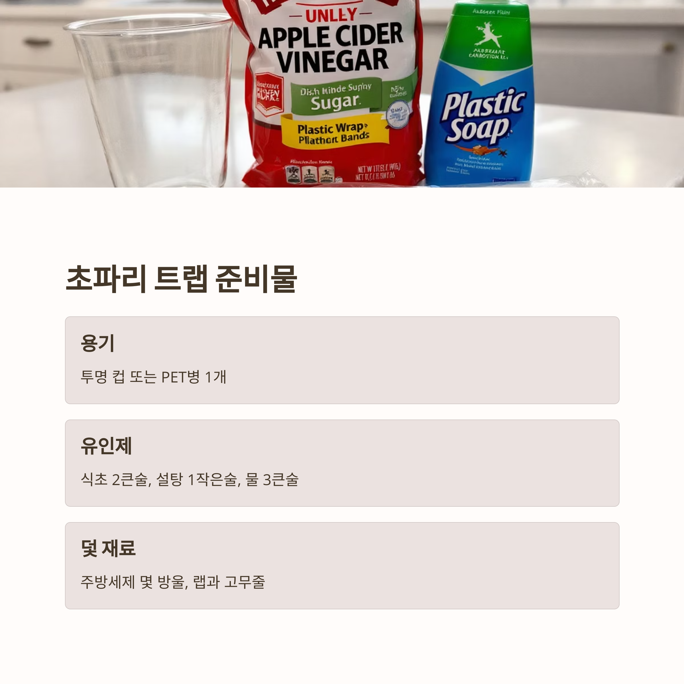 | 종이컵 트랩 | 종이컵, 랩, 이쑤시개, 유인액(식초+설탕+주방세제 약간) | 종이컵에 유인액을 1/3 정도 채우고 랩으로 씌운 뒤, 이쑤시개로 작은 구멍을 여러 개 뚫어주세요. |