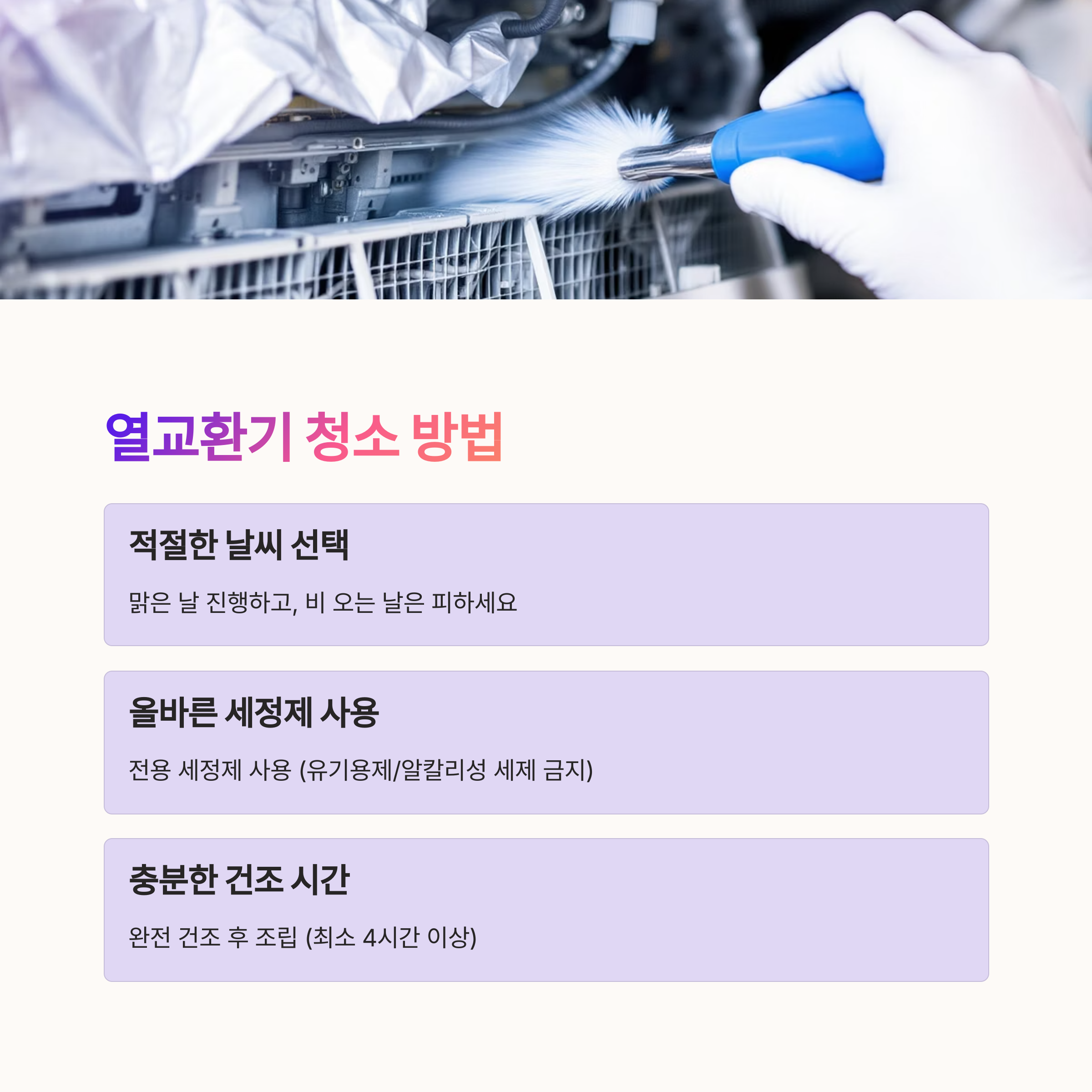 독한 화학세제 사용 자제: 너무 강한 화학세제는 부품을 부식시키거나 인체에 유해할 수 있습니다. 가급적 중성세제나 친환경 에어컨 세정제를 사용하세요.