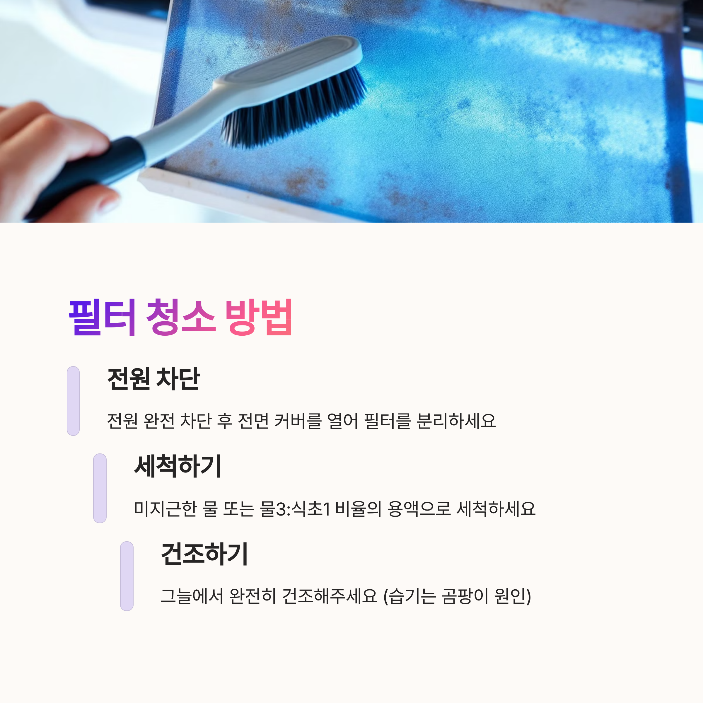 곰팡이가 심하다면 에어컨 전용 세정제를 사용하거나 베이킹소다를 푼 물에 잠시 담가두는 것도 좋아요. 세척 후에는 그늘에서 완전히 말려주세요. 햇볕에 직접 말리면 필터가 변형될 수 있으니 주의해야 합니다.