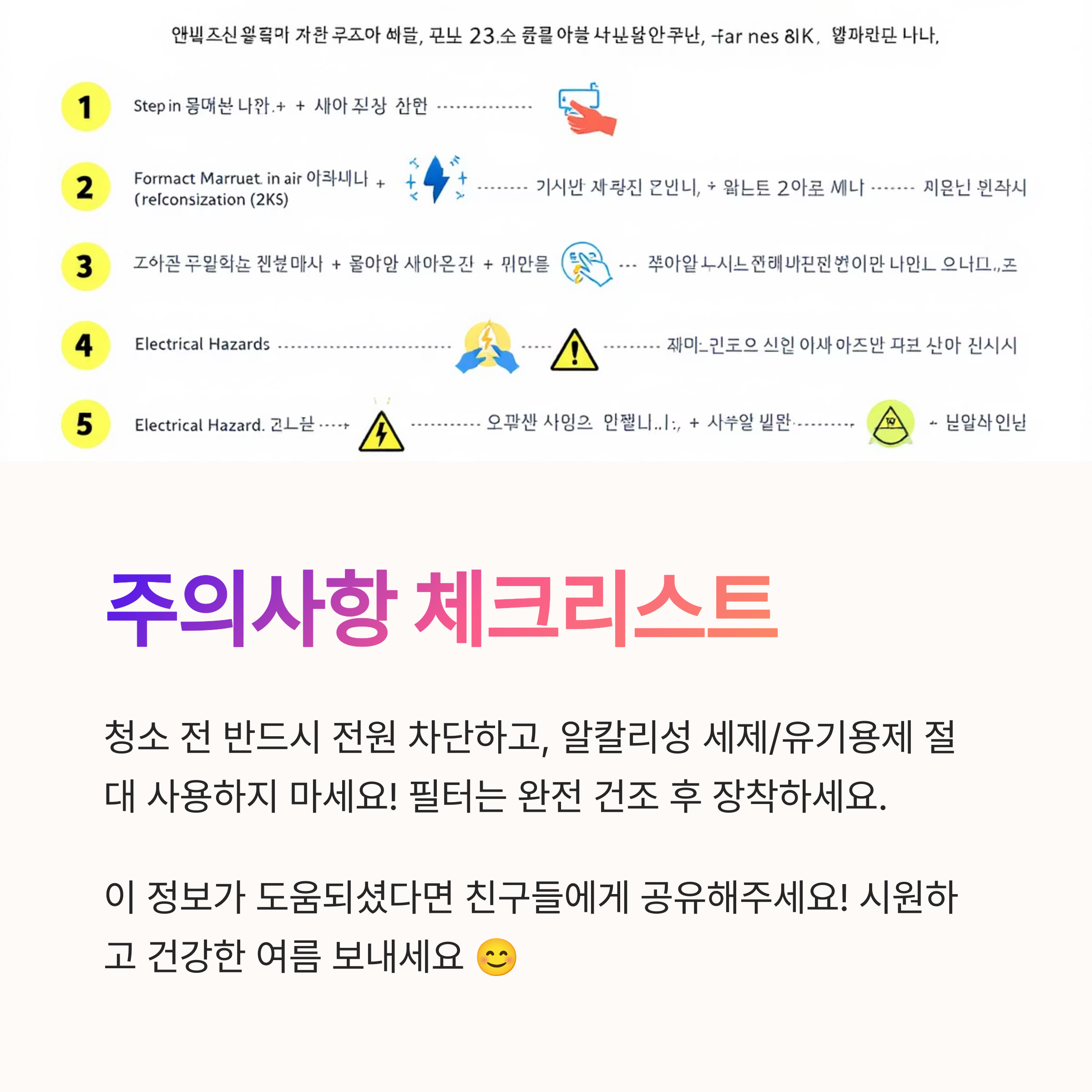 안전하고 효과적인 에어컨 청소를 위해 반드시 지켜야 할 에어컨 청소 주의사항 몇 가지를 강조해 드릴게요.