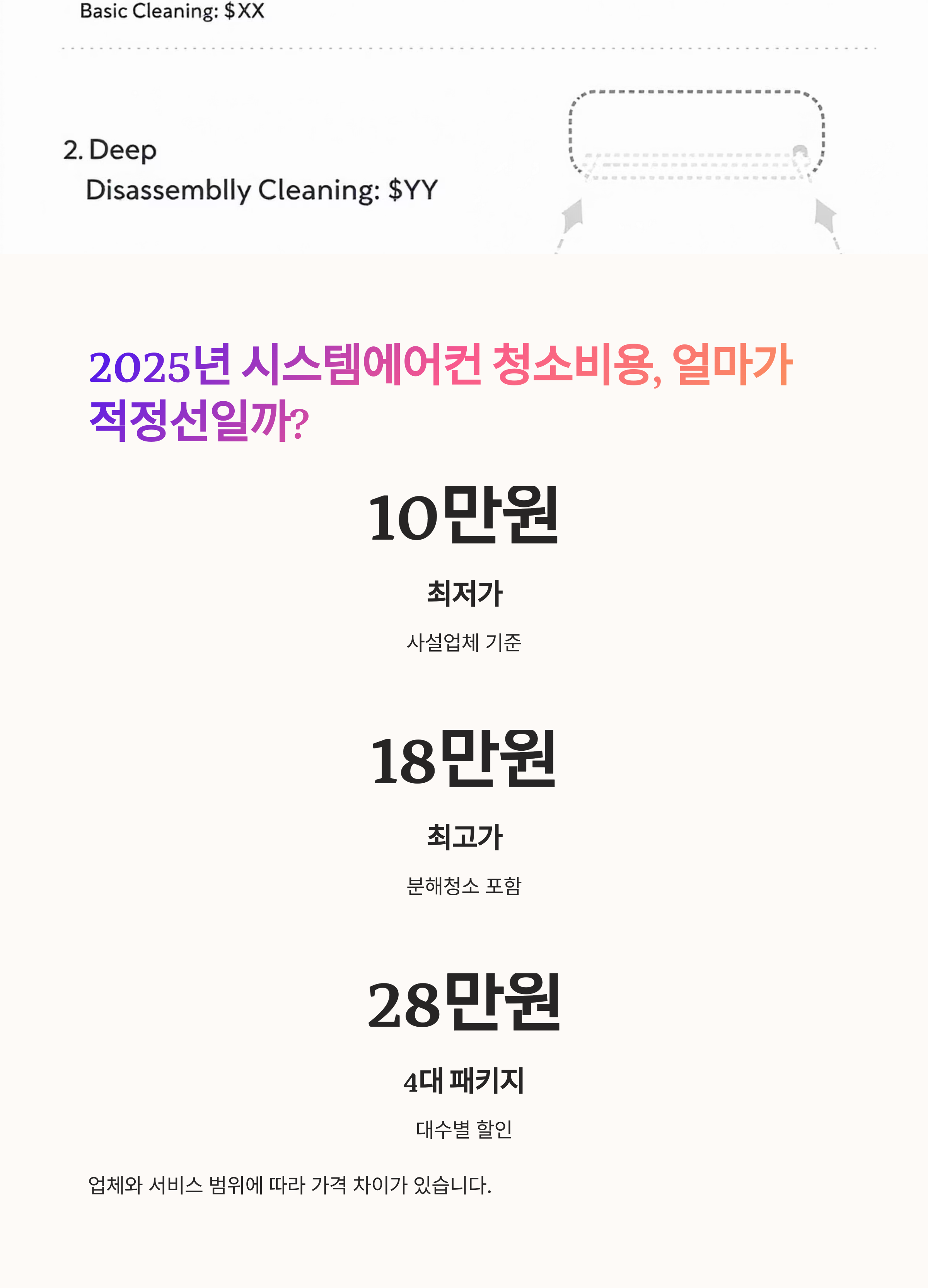 가장 궁금해하실 시스템에어컨 청소비용! 사실 이건 에어컨 종류, 수량, 오염 정도, 지역, 업체별 기술력 등에 따라 조금씩 달라질 수 있어요. 그래도 대략적인 평균 비용을 알아두면 예산을 짜고 업체를 비교하는 데 도움이 될 거예요. 📌