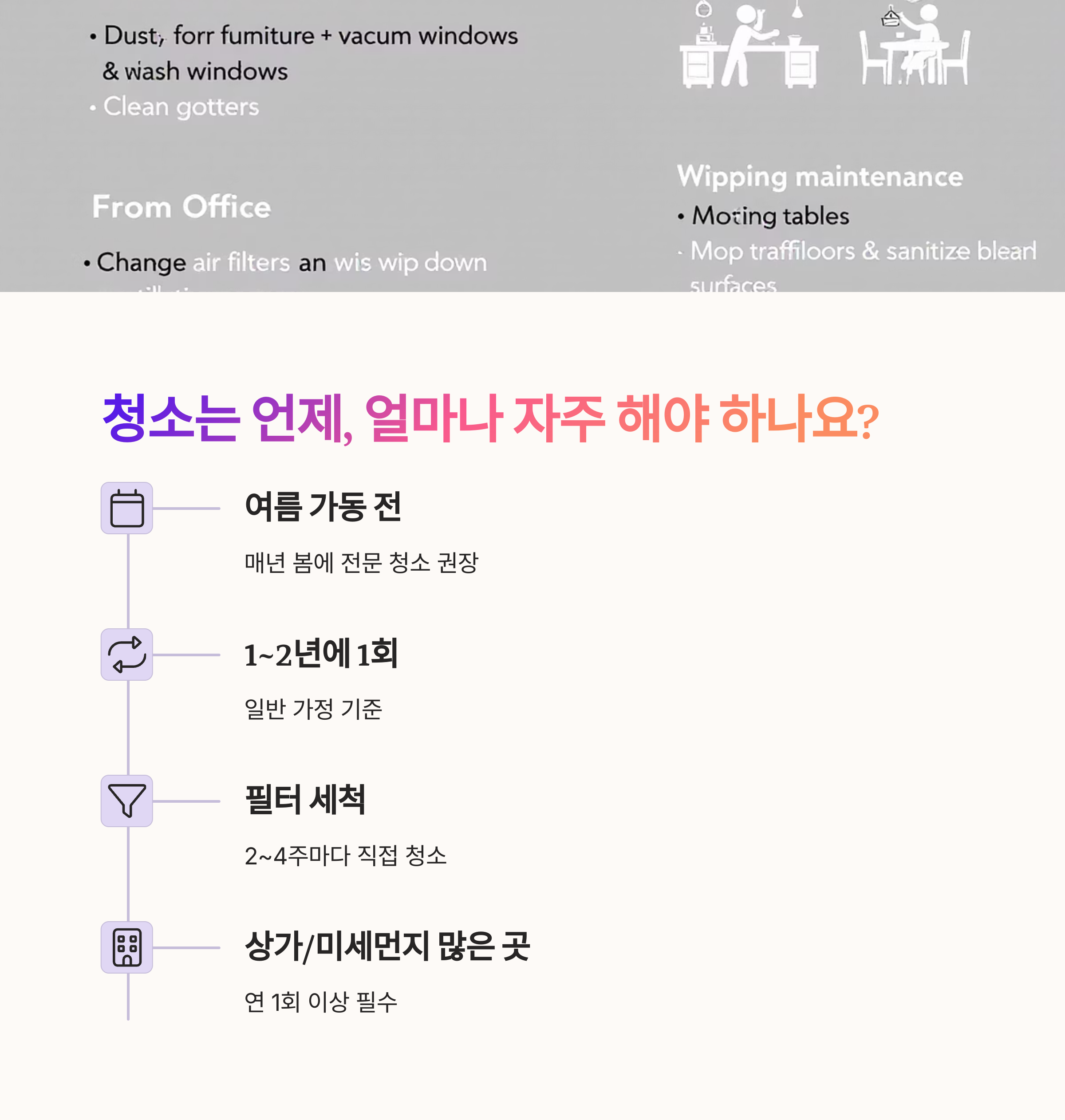 A. 사용 환경이나 시간에 따라 다르지만, 일반적으로 가정용은 1년에 1~2회, 사용량이 많은 사무실이나 상업시설은 1년에 2회 이상 또는 분기별 청소를 권장합니다. 특히 여름철 사용 전과 사용 후 청소해주시면 좋습니다.