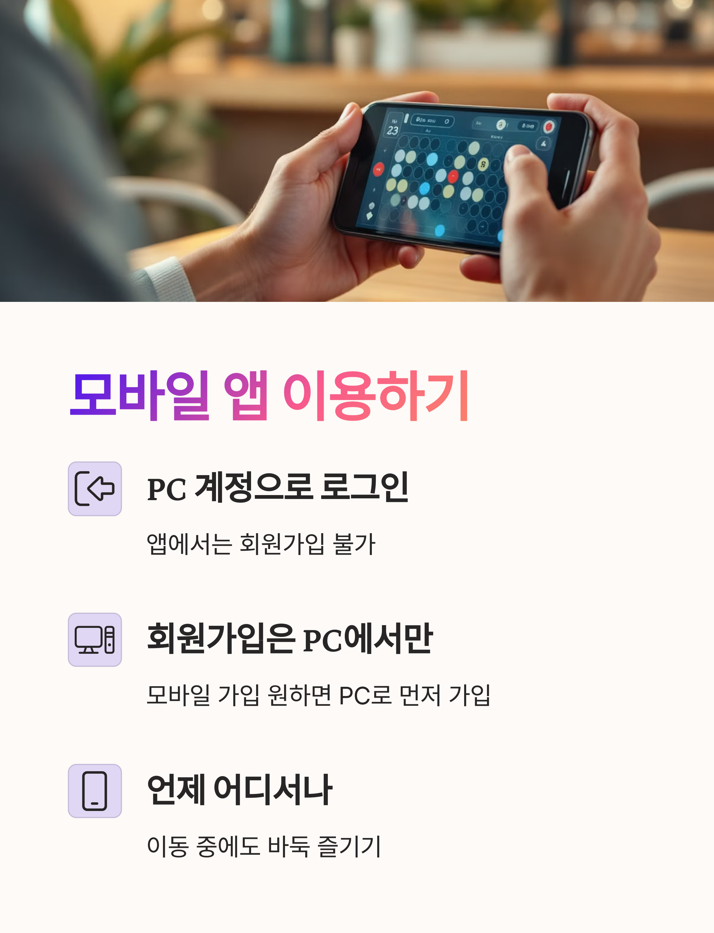 PC에서 사용하던 아이디로 로그인하면 기록이나 친구 목록 등이 연동되어서 더욱 편리해요. 이동 중이나 잠깐 시간이 날 때, 언제 어디서든 간편하게 바둑 한 판 즐길 수 있으니 정말 좋죠? 저도 모바일 앱 덕분에 바둑 실력이 녹슬지 않는 것 같아요. 😄