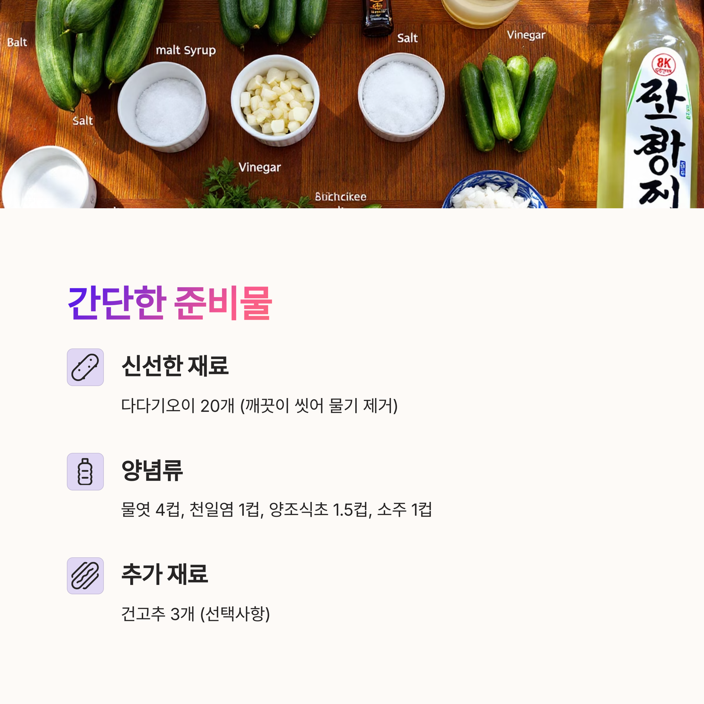 💡 Tip: 오이는 단단하고 곧은 백오이를 사용하는 것이 가장 아삭하고 맛있어요. 설탕, 식초, 소주는 동량 또는 기호에 맞게 설탕과 식초 양을 조절하셔도 좋습니다.