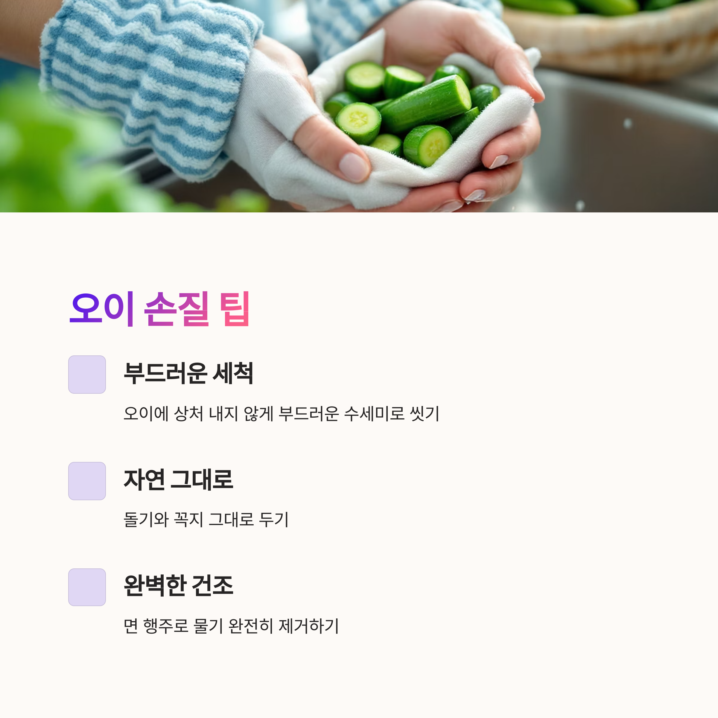 오이는 굵은소금으로 가볍게 문질러 씻거나 베이킹소다를 이용해 겉면의 돌기를 깨끗하게 닦아줍니다. 여기서 중요한 포인트! 세척한 오이는 키친타월이나 마른행주로 물기를 완벽하게 제거해야 합니다.