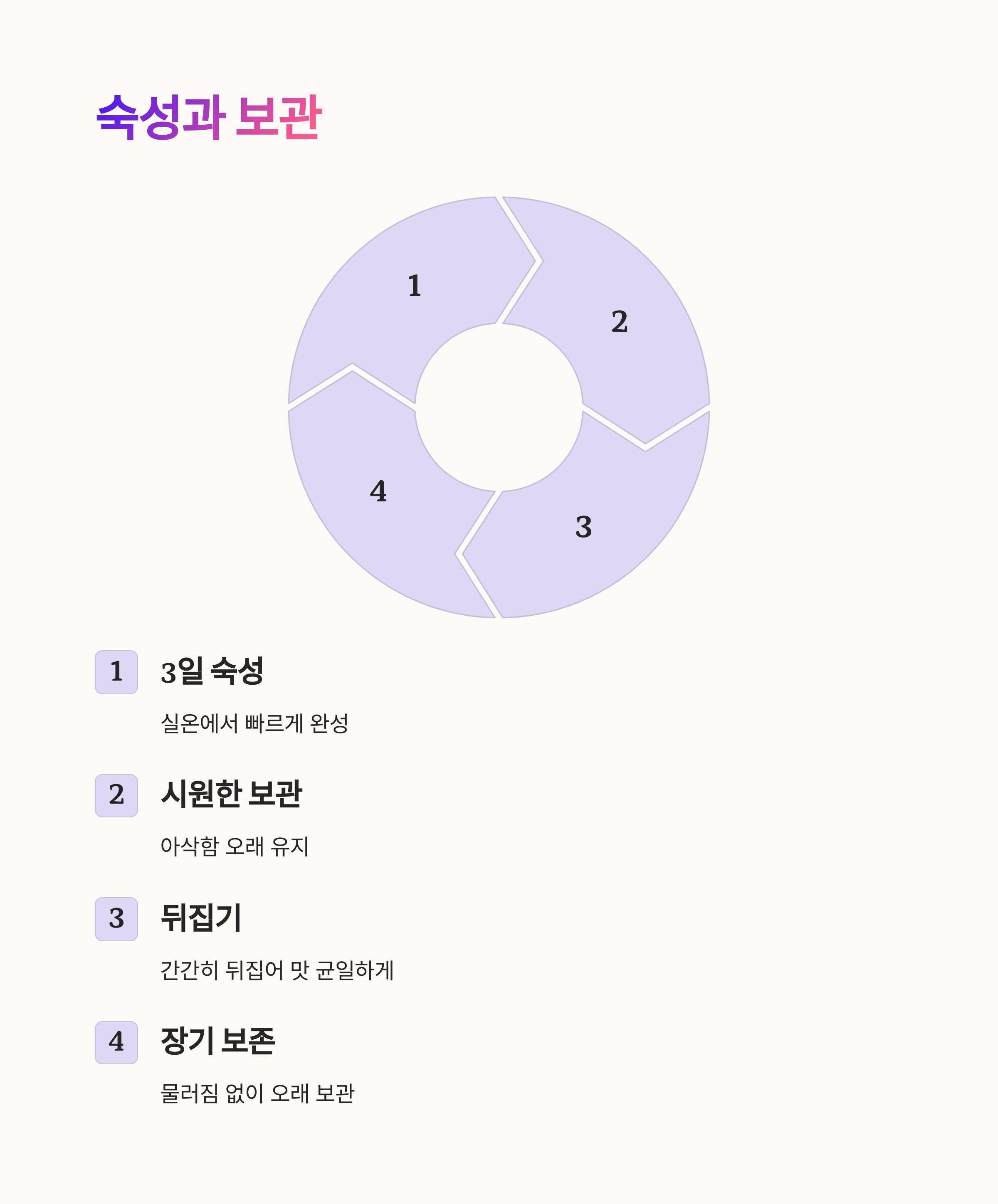 전통 방식은 소금물을 끓여 식힌 후 붓는 번거로운 과정이 필요했죠. 하지만 물을 사용하지 않으면 이런 과정이 모두 생략되어 정말 간편해요. 가장 큰 장점은 바로 '골마지'와 '무름 현상' 방지입니다.