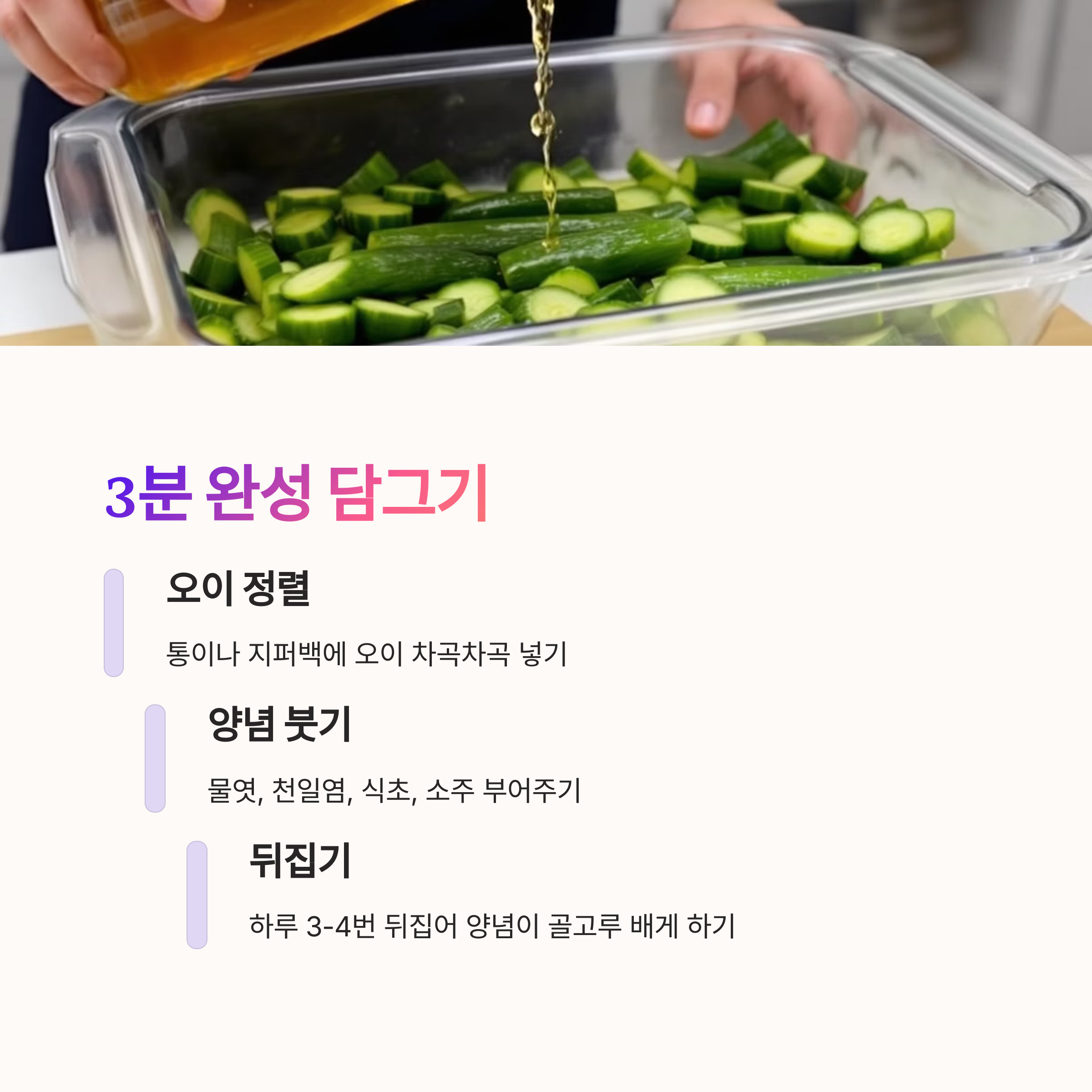 이 방법은 말 그대로 물을 단 한 방울도 사용하지 않아 실패 확률이 거의 없고, 오이의 수분만으로 절여져 훨씬 더 꼬들꼬들하고 맛이 깊답니다.