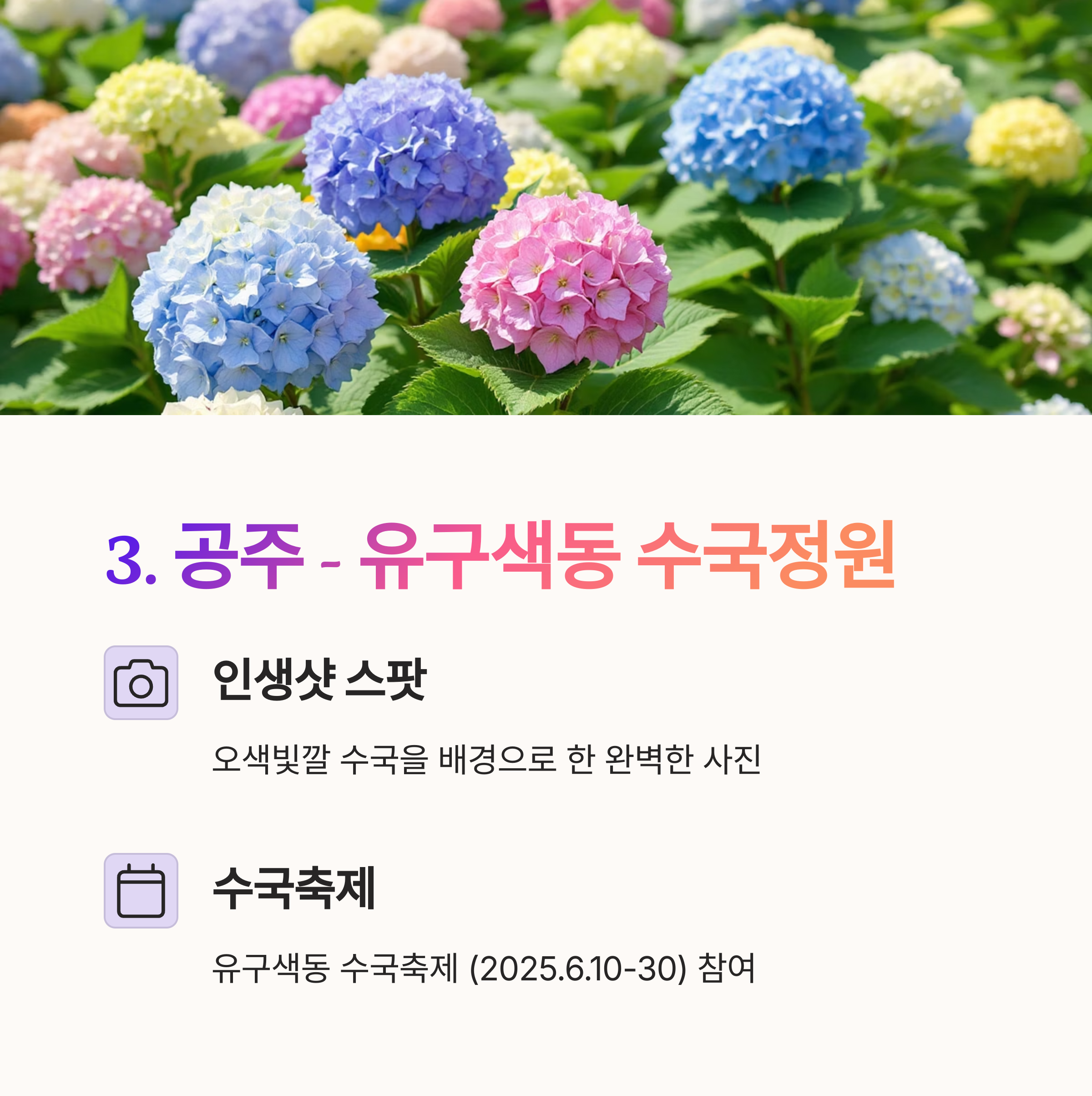 백제의 고도 공주가 6월에는 화려한 수국의 도시로 변신합니다. 바로 '유구색동수국정원' 덕분인데요. 유구천을 따라 약 1km에 걸쳐 조성된 정원에는 무려 22종의 다채로운 수국이 만개하여 장관을 이룹니다.